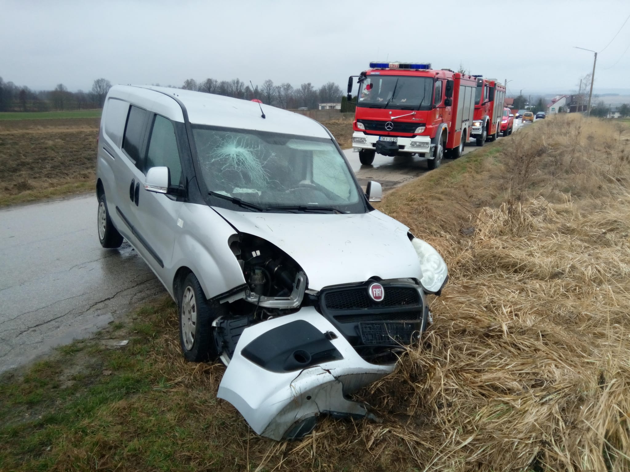 Na drodze powiatowej samochód osobowy Fiat Doblo, którym jechało dwóch mężczyzn zjechał z drogi i uderzył w przepust. 3 zastępy straży pożarnej dojechały na miejsce i zastały uszkodzony pojazd stojący w przydrożnym rowie i poszkodowanych poza pojazdem i pod opieką personelu Lotniczego Pogotowia Ratunkowego. Obaj mężczyźni, po przebadaniu zostali zabrani do szpitala: jeden zabrany przez Lotnicze Pogotowie Ratunkowe, a drugi pojechał ambulansem.