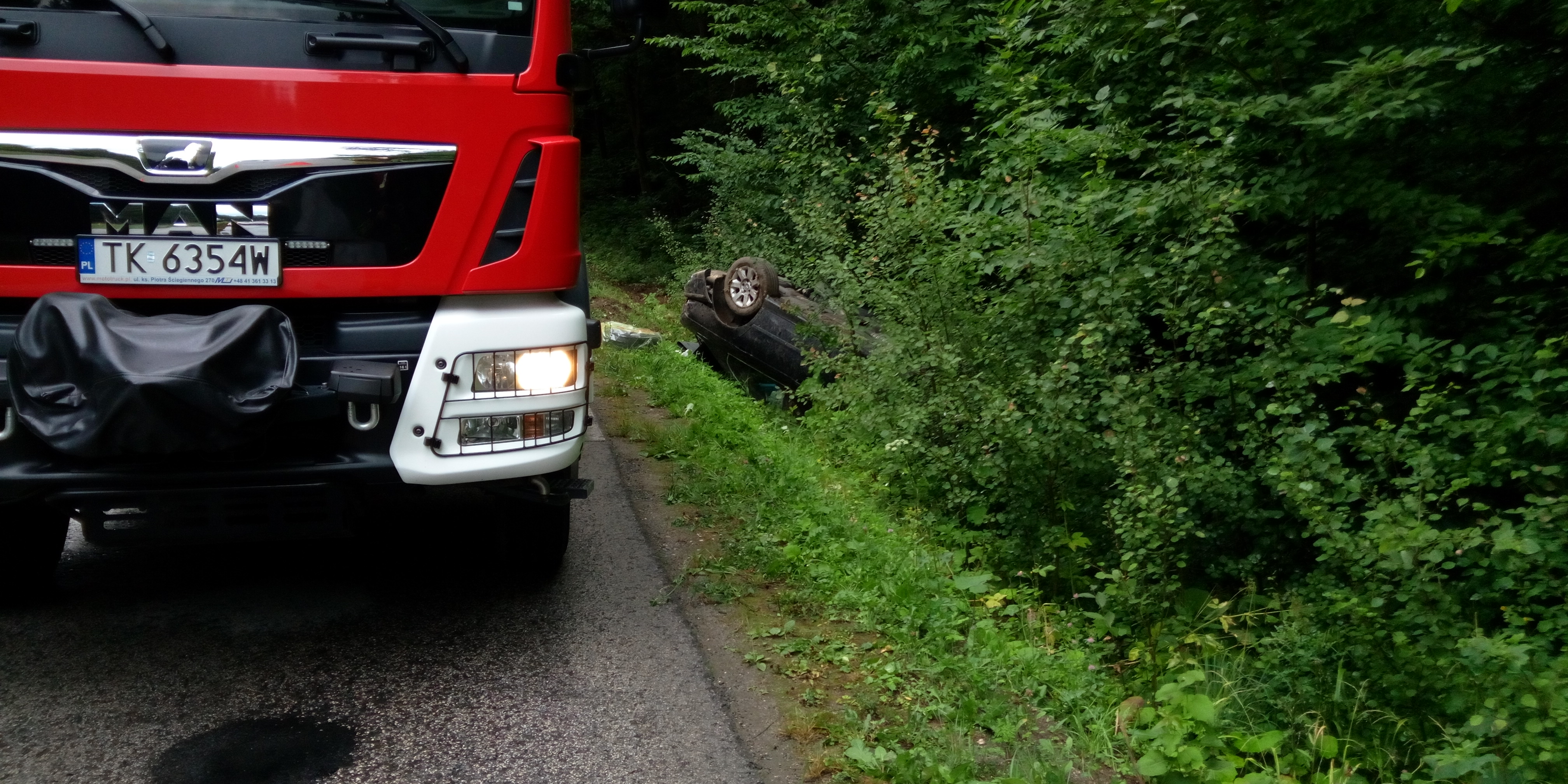 Na drodze powiatowej numer 1289T samochód osobowy marki BMW, którym jechał jedynie kierowca wypadł z jezdni, dachował i znajdował się przydrożnym rowie. Mężczyzna samodzielnie opuścił auto, a świadkowie zdarzenia udzielili mu pierwszej pomocy. Strażacy zabezpieczyli teren działań, przejęli opiekę nad poszkodowanym, odłączyli zasilanie z akumulatora i zakręcili zawór na zbiorniku LPG w uszkodzonym pojeździe. Zespół Ratownictwa Medycznego, po przebadaniu mężczyzny podjął decyzję o zabraniu go do szpitala. Podczas działań ruch na drodze odbywał się wahadłowo i jedynie na czas gdy usuwano zniszczone auto zamknięto całkowicie przejazd.