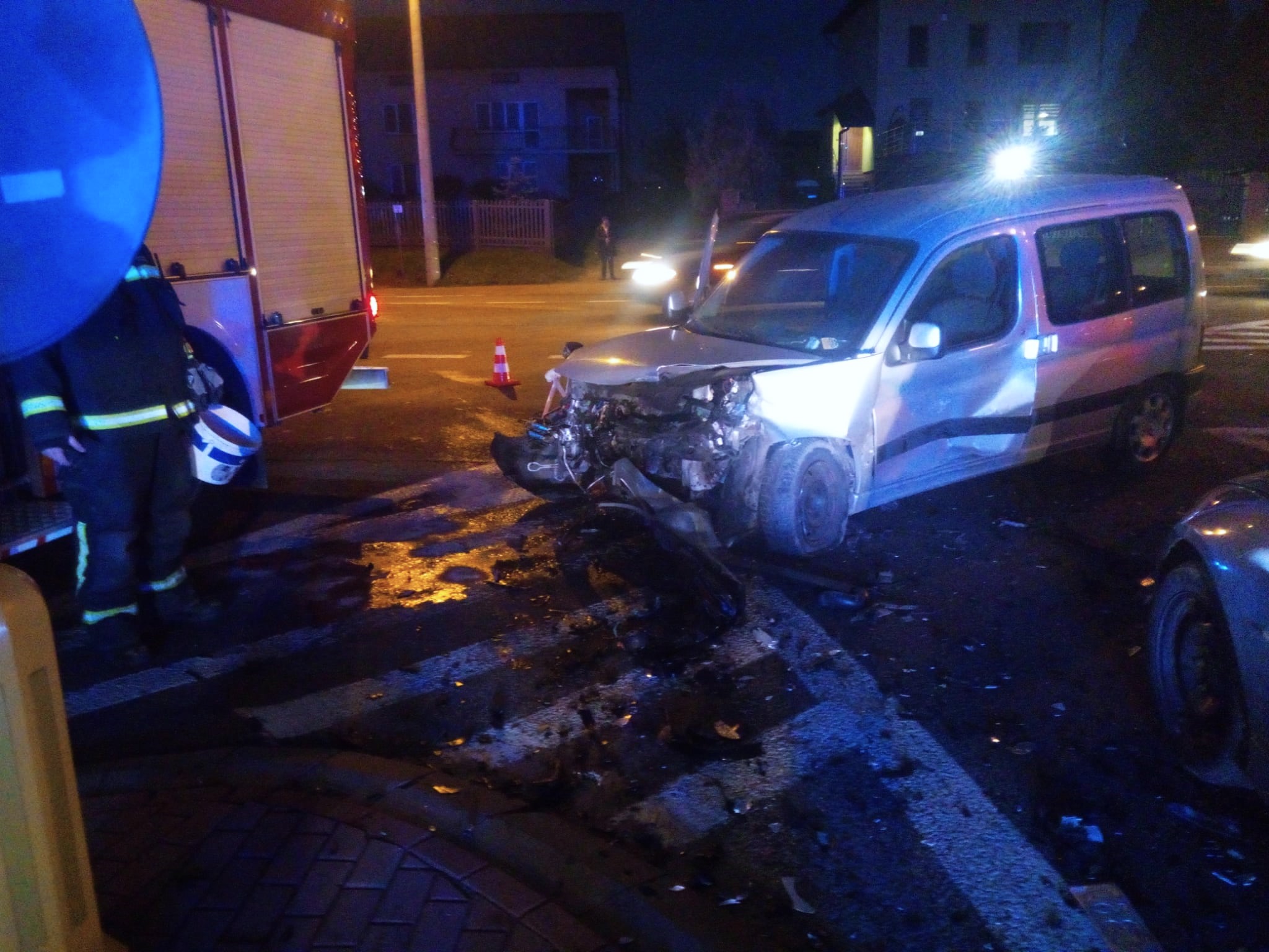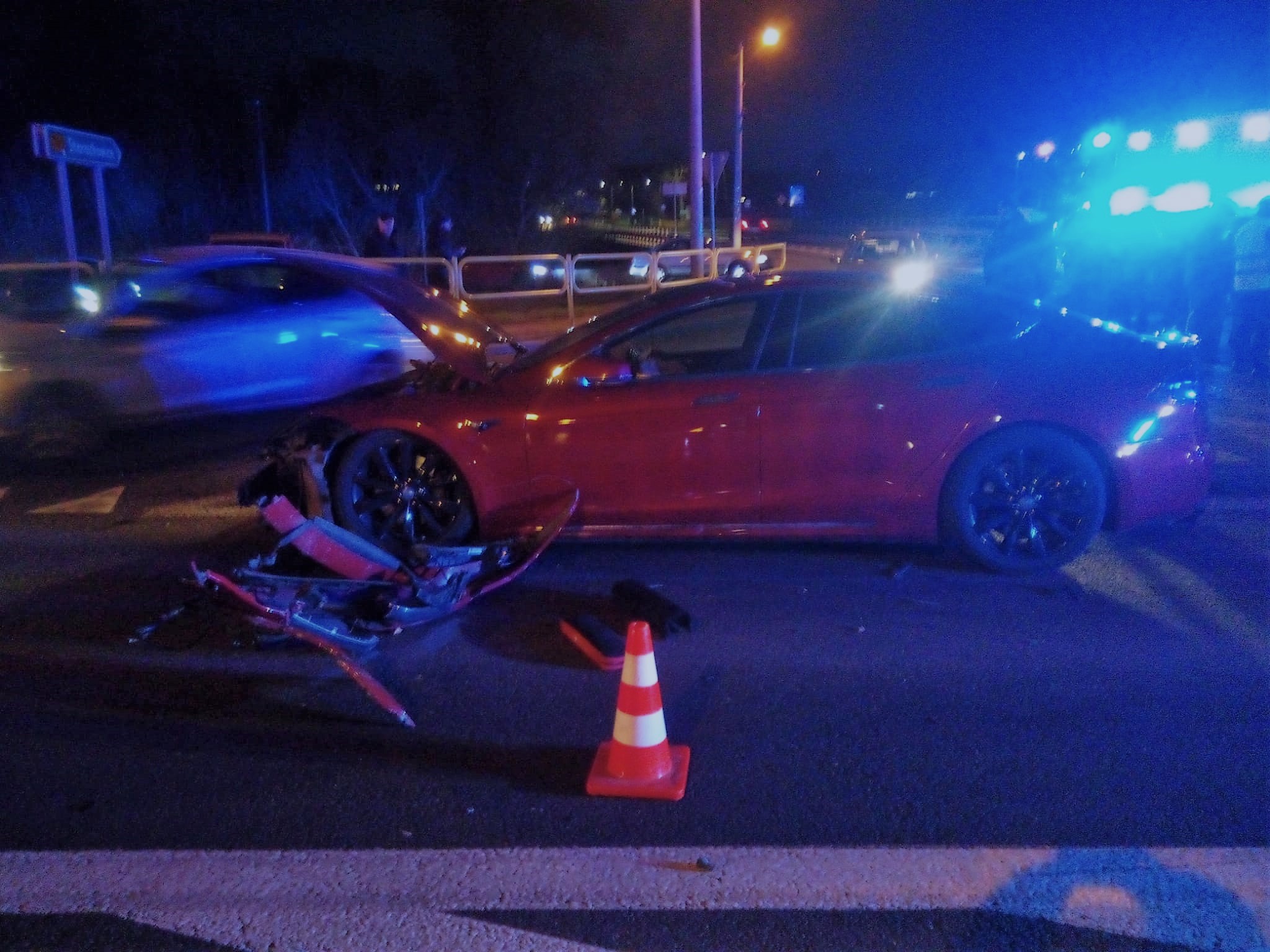 Auta osobowe: Tesla S, BMW 5 i Peugeot Partner zderzyły się na krajowej 74. Podróżowało nimi łącznie 6 osób w tym jedno dziecko. Wszystkie osoby samodzielnie opuściły pojazdy. Strażacy zabezpieczyli miejsce zdarzenia, odłączyli zasilanie z akumulatorów i sorbentem usunęli plamę płynów ropopochodnych. Jednocześnie wdrożyli procedury kwalifikowanej pierwszej pomocy w stosunku do dwóch osób i dziecka. Pozostałe osoby nie wymagały pomocy medycznej. Zespół Ratownictwa Medycznego przebadał całą trójkę i podjął decyzję o zabraniu jedynie dziecka do szpitala. Na zakończenie uprzątnięto pozostałości przywracając ruch na drodze.