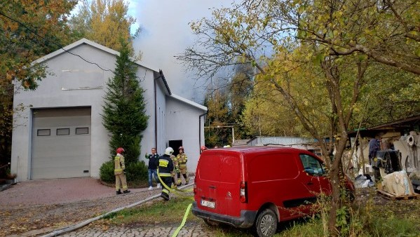 Informacja o pożarze, który wybuchł w jednym z pomieszczeń odlewni figur dekoracyjnych w Dąbrowie gmina Masłów dotarła do kieleckich strażaków 11 października 2024 roku około godziny 16:20.