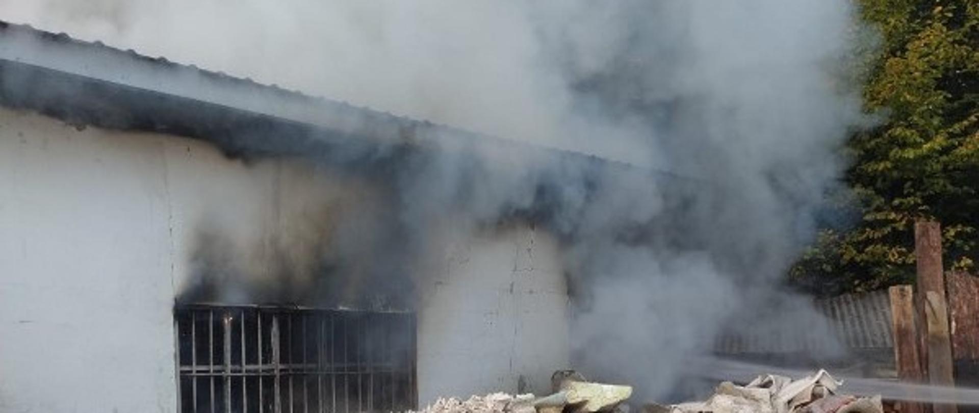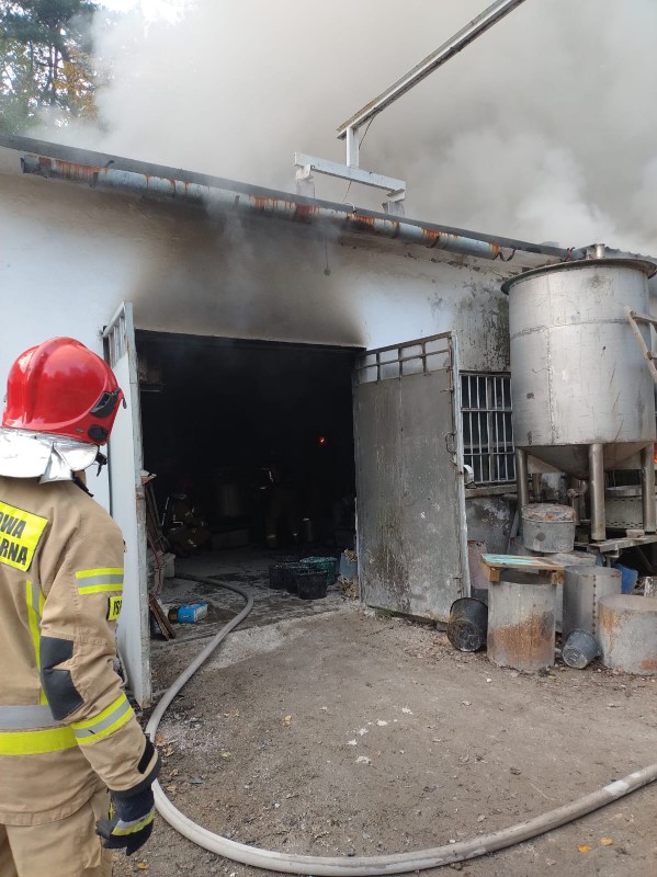 7 zastępów ruszyło do akcji. Strażacy zastali w pełni rozwinięty pożar w ostatnim budynku ciągu zabudowań przylegających do siebie. Zabezpieczyli teren i rozpoczęli działania: gasząc ogień i broniąc sąsiednich zabudowań i pobliskiego lasu. Jednocześnie strażacy zrywali pokrycie dachowe aby odsłonić niedostępne zarzewia ognia. Na terenie zakładu przebywał tylko właściciel, który został przebadany przez Zespół Ratownictwa Medycznego i pozostał na miejscu zdarzenia. Po ugaszeniu pożaru ratownicy skontrolowali pogorzelisko kamerą termowizyjną dogaszając odnajdywane zarzewia ognia, a las w najbliższym sąsiedztwie palącego się budynku dokładnie przelali wodą. Działania trwały ponad 3 godziny