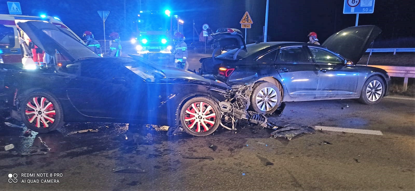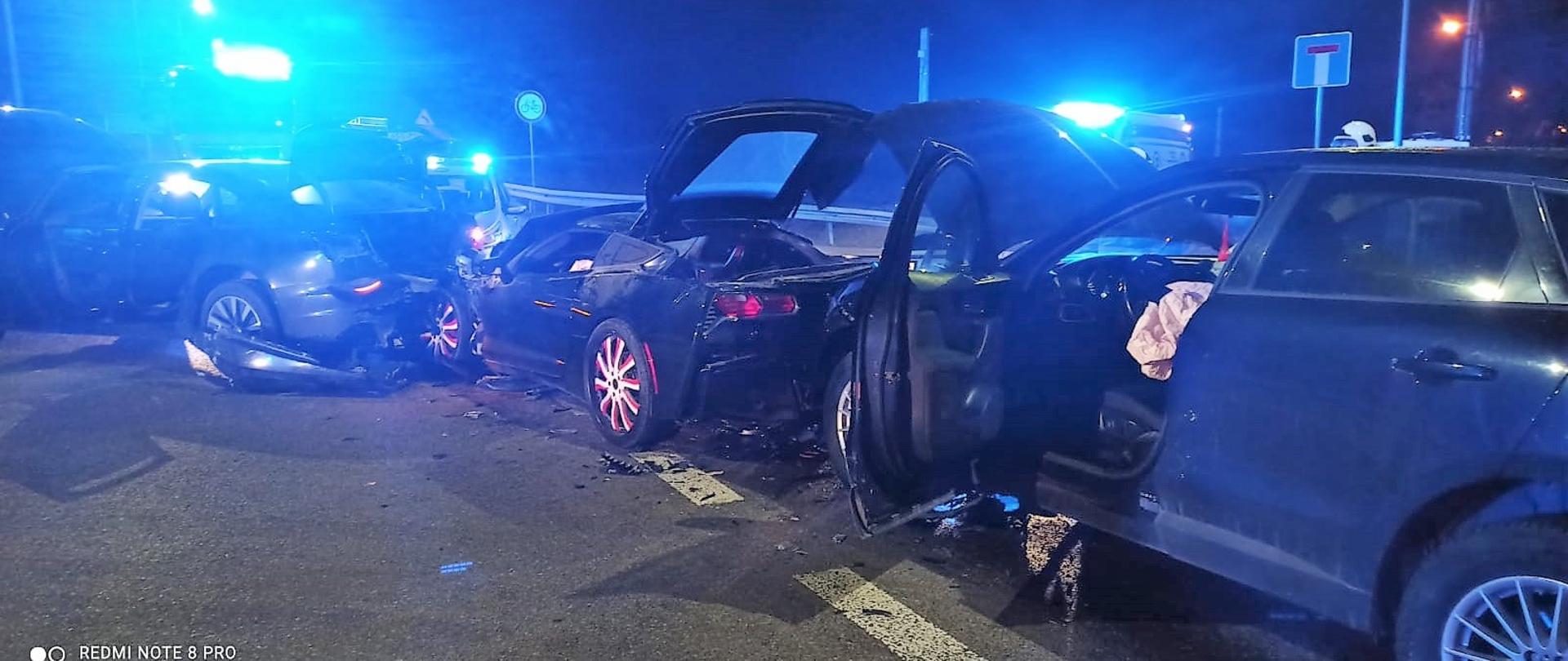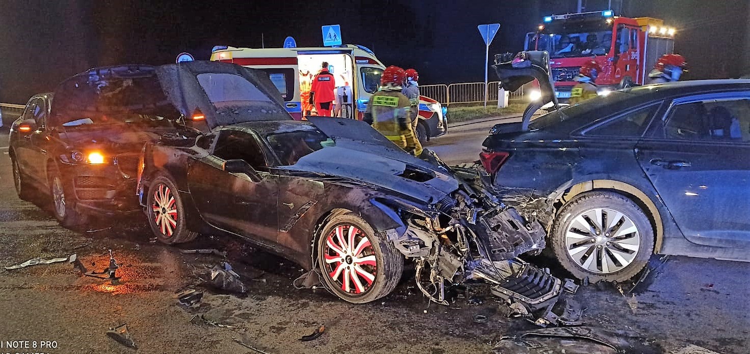 Trzy samochody osobowe: Audi A6, Chevrolet Corvette i Jaguar F-Pace, którymi podróżowali jedynie kierowcy uległy zderzeniu, a wszyscy uczestnicy zdarzenia samodzielnie opuścili pojazdy. Strażacy zabezpieczyli i oznakowali miejsce zdarzenia oraz odłączyli zasilanie z akumulatorów w pojazdach. Jednocześnie zaopiekowali się osobami poszkodowanym udzielając im wsparcia psychicznego do czasu przybycia Zespołu Ratownictwa Medycznego. Personel medyczny przebadał poszkodowanych i podjął decyzję o zabraniu kierowcy samochodu Audi do szpitala. Podczas trwania akcji ratowniczej droga była całkowicie zamknięta. Na zakończenie strażacy usunęli powstałą na jezdni plamę oleju i płynów eksploatacyjnych.