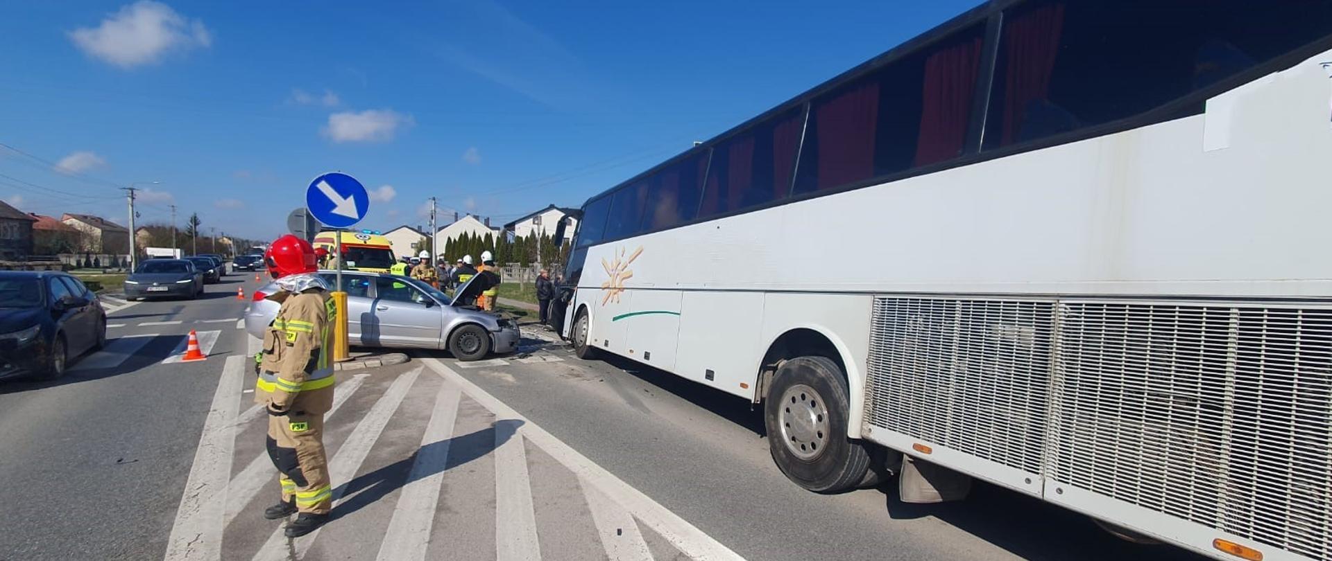Na drodze krajowej numer 74 doszło do zderzenia samochodu osobowego marki Audi A3 oraz autobusu turystycznego Bova. Uszkodzone pojazdy całkowicie blokowały jeden pas drogi. Autem osobowym jechał tylko kierujący, a autobusem podróżowało 27 osób. Wszystkie osoby znajdowały się poza pojazdami i tylko kierowca Audi oraz jedna pasażerka autobusu wymagały przebadania przez Zespół Ratownictwa Medycznego. Nikt nie został zabrany do szpitala. Na pomoc przybyły 4 zastępy straży pożarnej: ratownicy zabezpieczyli i oznakowali teren działań, wdrożyli procedury z zakresu kwalifikowanej pierwszej pomocy w stosunku do poszkodowanych do czasu przybycia ZRM. Równocześnie odłączyli zasilanie z akumulatorów w uszkodzonych pojazdach i usunęli powstałe na jezdni wycieki. Czas trwania akcji to ponad 3 godziny.