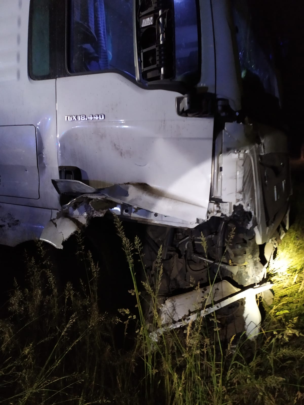 Na drodze krajowej numer 74 ciągnik siodłowy z naczepą marki MAN uderzył w stojący na poboczu samochód osobowy marki Renault Trafic. W wyniku zderzenia pojazdy zsunęły się ze skarpy i znalazły się poza drogą. Kierowca ciężarówki nie wymagał pomocy medycznej zaś mężczyzna z auta osobowego, po przebadaniu przez personel Zespołu Ratownictwa Medycznego został zabrany do szpitala. Strażacy zabezpieczyli teren działań, odłączyli zasilanie z akumulatorów w obu autach i na zakończenie działań uprzątnęli jezdnię. Akcja ratownicza trwała ponad 4 godziny i udział w niej wzięły 2 zastępy straży pożarnej.
