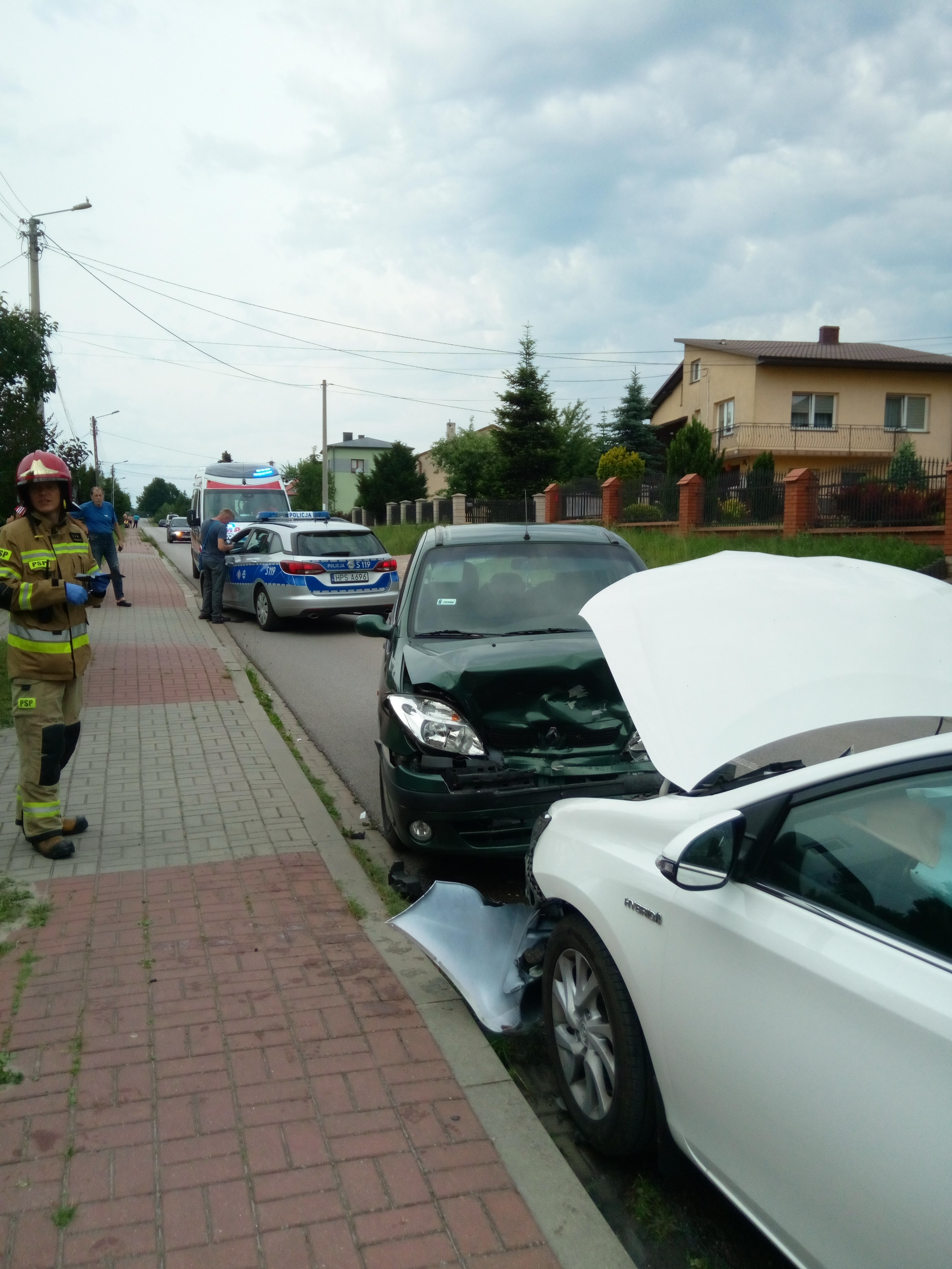Dwa samochody osobowe: Toyota Auris i Renault Scenic zderzyły się na drodze powiatowej w miejscowości Samsonów. Podróżujący autami kierowcy samodzielnie wysiedli z pojazdów, a po przebadaniu przez Zespół Ratownictwa Medycznego jeden z nich został zabrany do szpitala. Uszkodzone samochody stojąc na jezdni blokowały jeden pas ruchu. Strażacy zabezpieczyli teren, odłączyli zasilanie z akumulatorów w autach i usunęli powstałą na jezdni plamę płynów eksploatacyjnych.