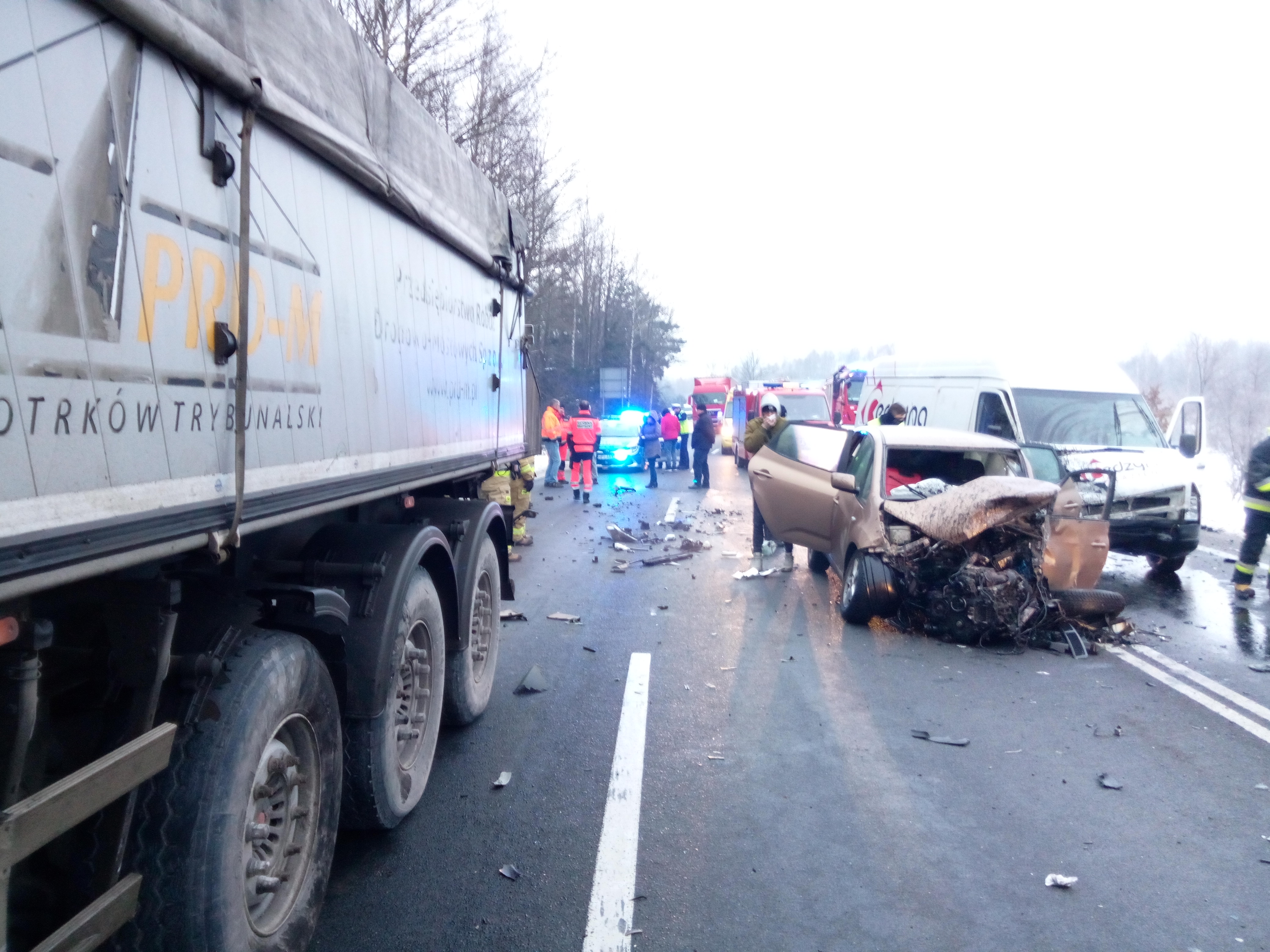 7 lutego 2023r. w miejscowości Przyjmo gm. Miedziana Góra, doszło do zderzenia pięciu pojazdów: trzech samochodów osobowych, busa oraz ciężarówki.