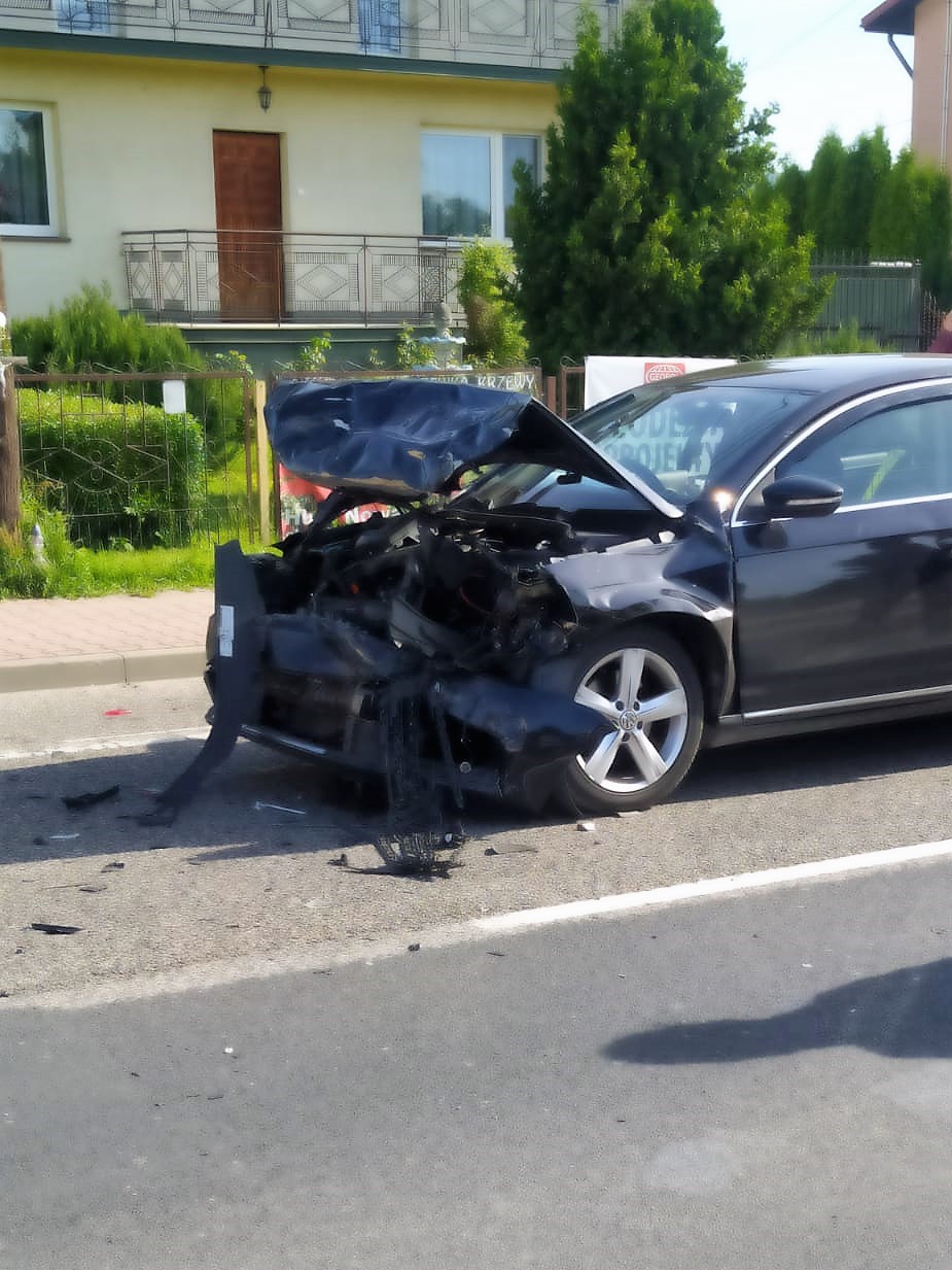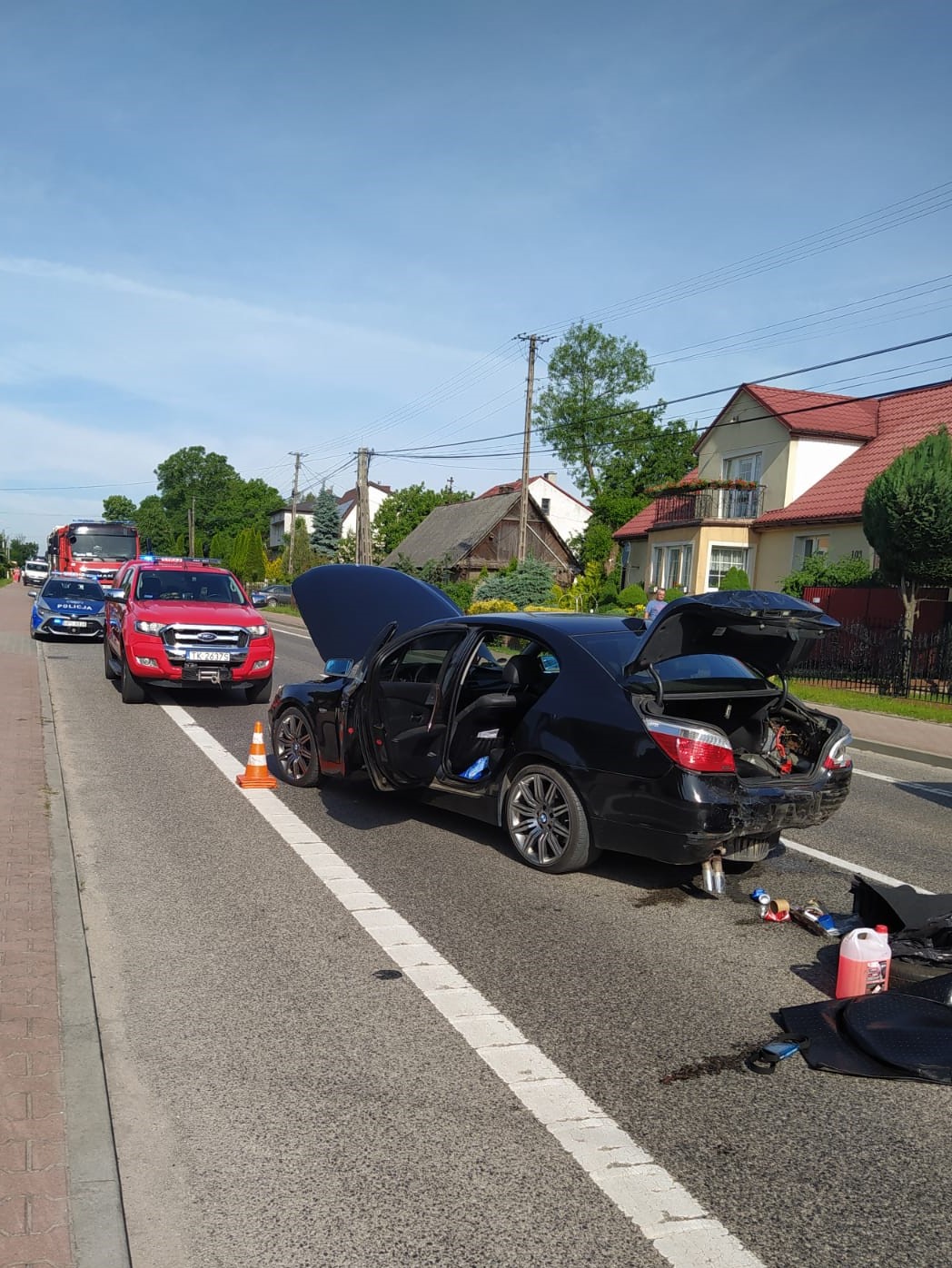 Dwa samochody osobowe: Volkswagen Passat oraz BMW E60 zderzyły się na drodze wojewódzkiej w miejscowości Bieliny blokując całkowicie ruch. Wszystkie osoby uczestniczące w zdarzeniu samodzielnie opuściły auta. Strażacy zabezpieczyli miejsce zdarzenia, odłączyli zasilanie z akumulatorów w uszkodzonych pojazdach oraz zakręcili zawór butli LPG w jednym z nich. Jednocześnie wdrożyli procedury z zakresu kwalifikowanej pierwszej pomocy w stosunku do osób poszkodowanych. Personel Zespołów Ratownictwa Medycznego przebadał uczestników zderzenia i finalnie zabrał do szpitala 2 osoby, które podróżowały Volkswagenem oraz kierowcę z BMW. W dalszej kolejności usunięto plamy płynów eksploatacyjnych z jezdni oraz przemieszczono uszkodzone pojazdy na pobocze przywracając płynny ruch na drodze wojewódzkiej.