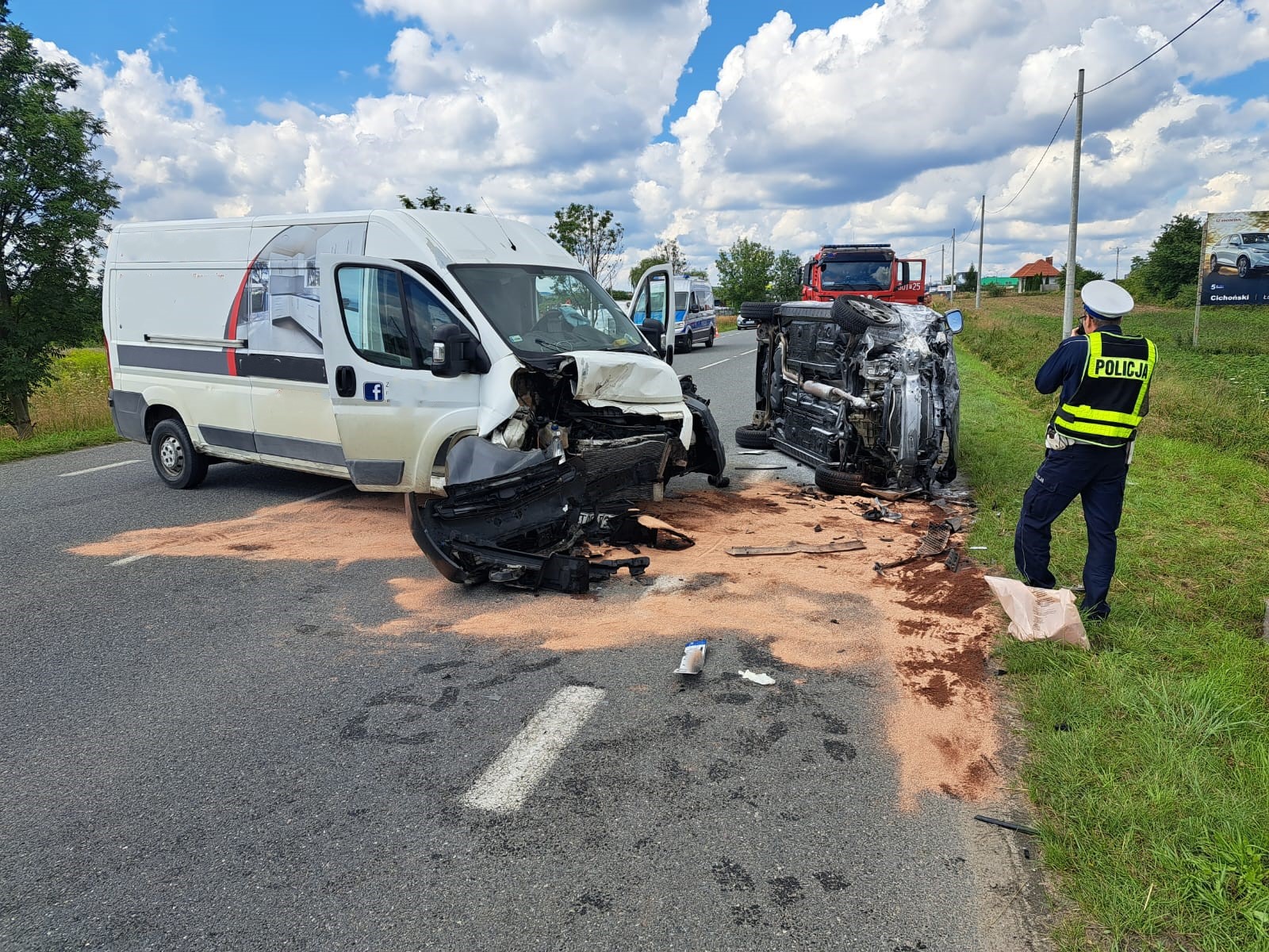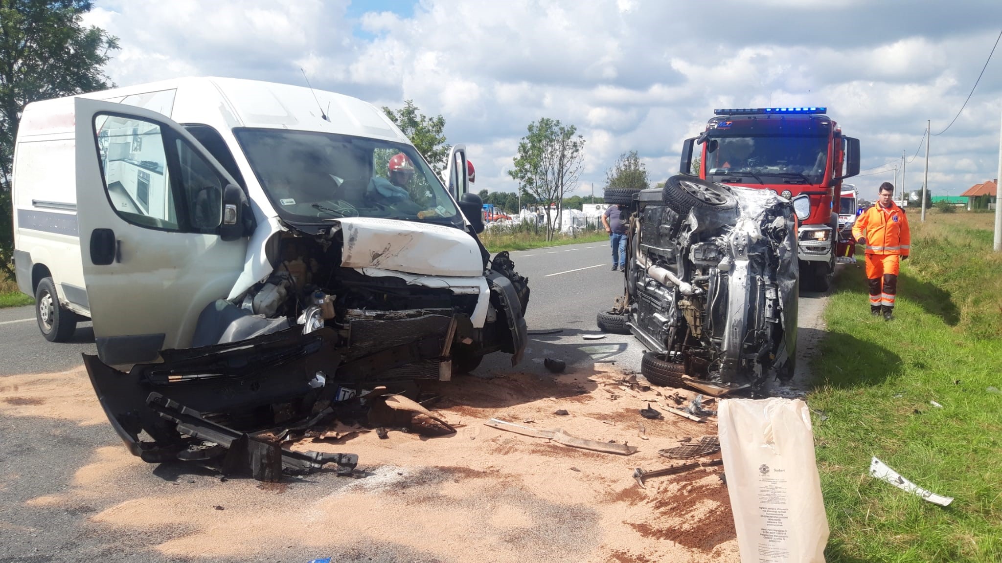 Na prostym odcinku drogi powiatowej zderzyły się dwa auta: samochód osobowy Toyota Verso i bus Citroen Jumper w wyniku czego auto osobowe przewróciło się na bok i zatarasowało jeden pas drogi. Drugi pojazd stał na kołach na środku drogi. Samochodami podróżowali jedynie kierowcy, którzy opuścili pojazdy o własnych siłach przed przybyciem służb. Strażacy oznakowali i zabezpieczyli teren działań udzielając jednocześnie pomocy poszkodowanym. Odłączyli także zasilanie z akumulatorów w pojazdach i usunęli plamę płynów eksploatacyjnych z jezdni. Zespół Ratownictwa Medycznego, po przebadaniu zabrał kobietę z Toyoty do szpitala. Na zakończenie strażacy ustawili przewrócony pojazd na koła i oba auta zepchnięto na pobocze. W trakcie działań droga powiatowa numer 14264 była całkowicie zablokowana.