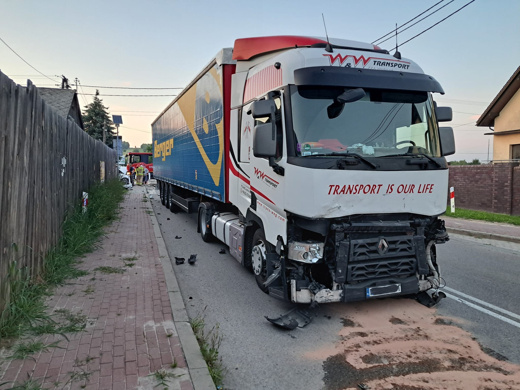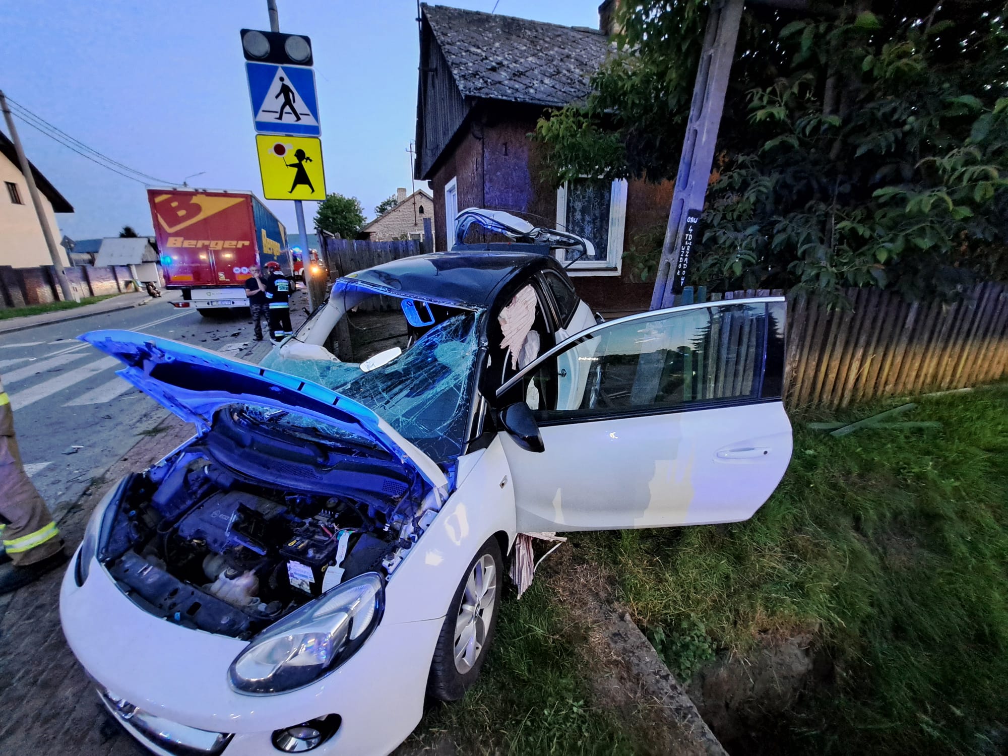 Zgłoszenie o zderzeniu 2 samochodów ciężarowego Renault z naczepą i osobowego Opla wpłynęło 21 lipca 2025 roku około godziny 20:00.