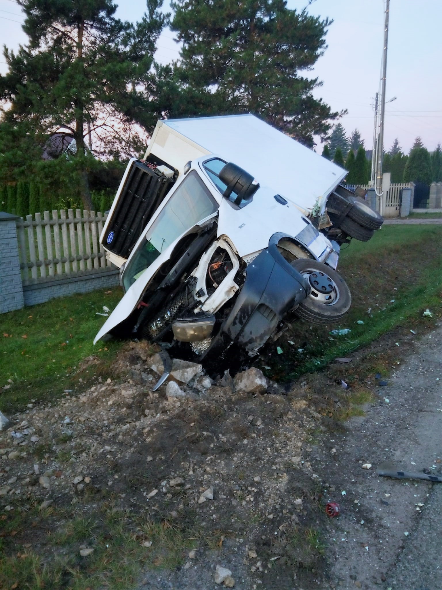 Samochód dostawczy Iveco Daily z chłodnią przewożący żywność i auto osobowe Seat Toledo zderzyły się na drodze krajowej numer 74 w wyniku czego samochód-chłodnia wpadł do przydrożnego rowu, a osobowy Seat stał bezpiecznie na pasie awaryjnym. Pojazdami jechali jedynie kierowcy, którzy samodzielnie je opuścili, a po przebadaniu przez Zespół Ratownictwa Medycznego pozostali na miejscu zdarzenia. Strażacy, po zabezpieczeniu i oznakowaniu terenu odłączyli zasilanie z akumulatorów w obu pojazdach oraz ustabilizowali podporami leżący na boku samochód dostawczy. Usunęli też powstałą na jezdni plamę płynów eksploatacyjnych. Po zakończeniu działań wyjaśniających okoliczności zdarzenia Iveco Daily został przemieszczony przy użyciu wyciągarki w celu ustawienia go w stabilnej pozycji.
