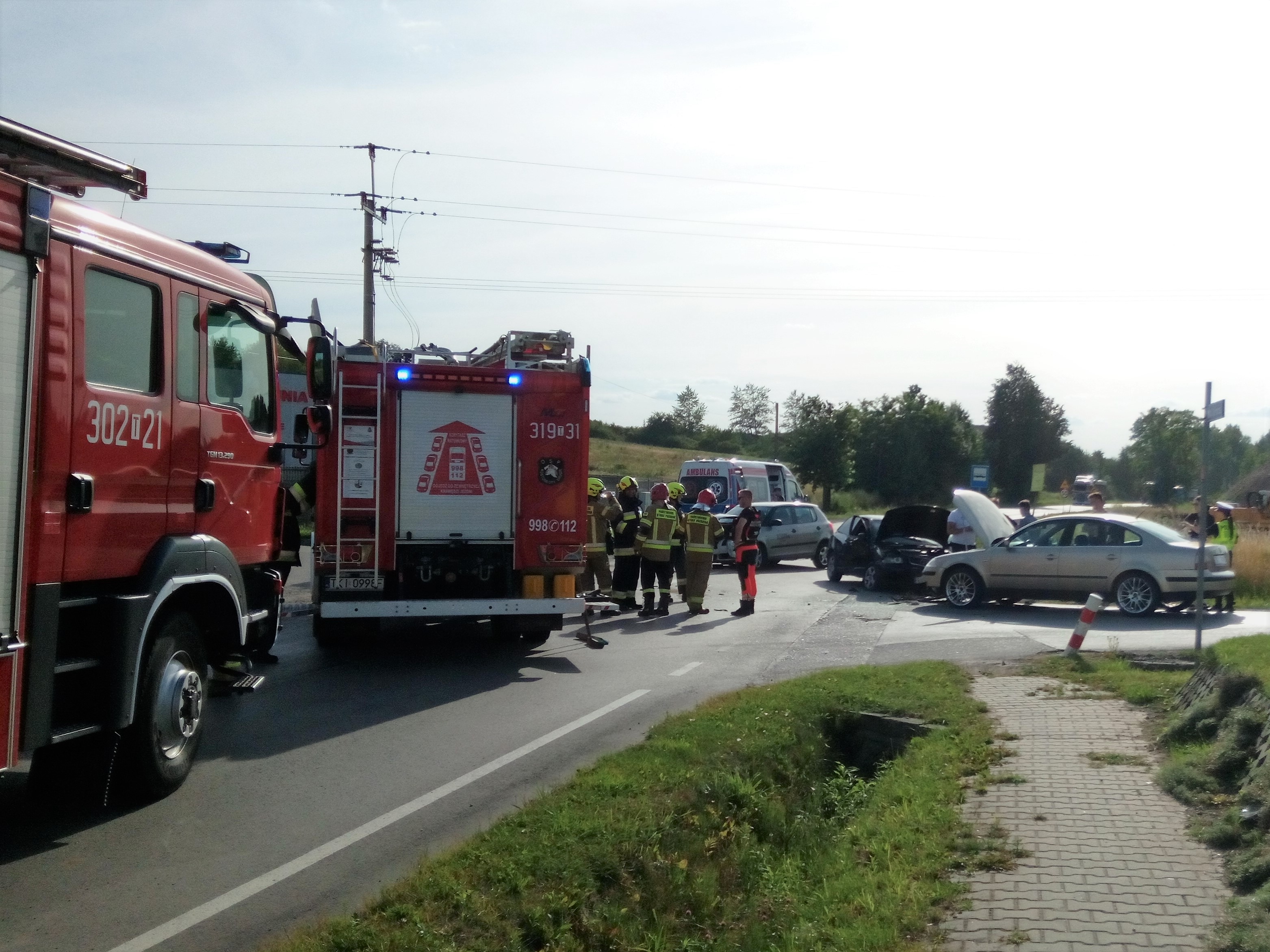 Trzy samochody osobowe: Skoda Fabia, Audi A3 oraz Volkswagen Passat, którymi podróżowało łącznie 5 osób zderzyły się na drodze wojewódzkiej w miejscowości Kostomłoty gmina Miedziana Góra. Strażacy zabezpieczyli teren działań i udzielili kwalifikowanej pierwszej pomocy osobom poszkodowanym. Jednocześnie odłączyli zasianie z akumulatorów w autach i zakręcili zawór butli LPG. Zespół Ratownictwa Medycznego, który przebadał uczestników zdarzenia zabrał 3 osoby do szpitala. Po zakończeniu czynności policyjnych oraz usunięciu uszkodzonych aut ratownicy zlikwidowali powstałą na jezdni plamę płynów eksploatacyjnych.
