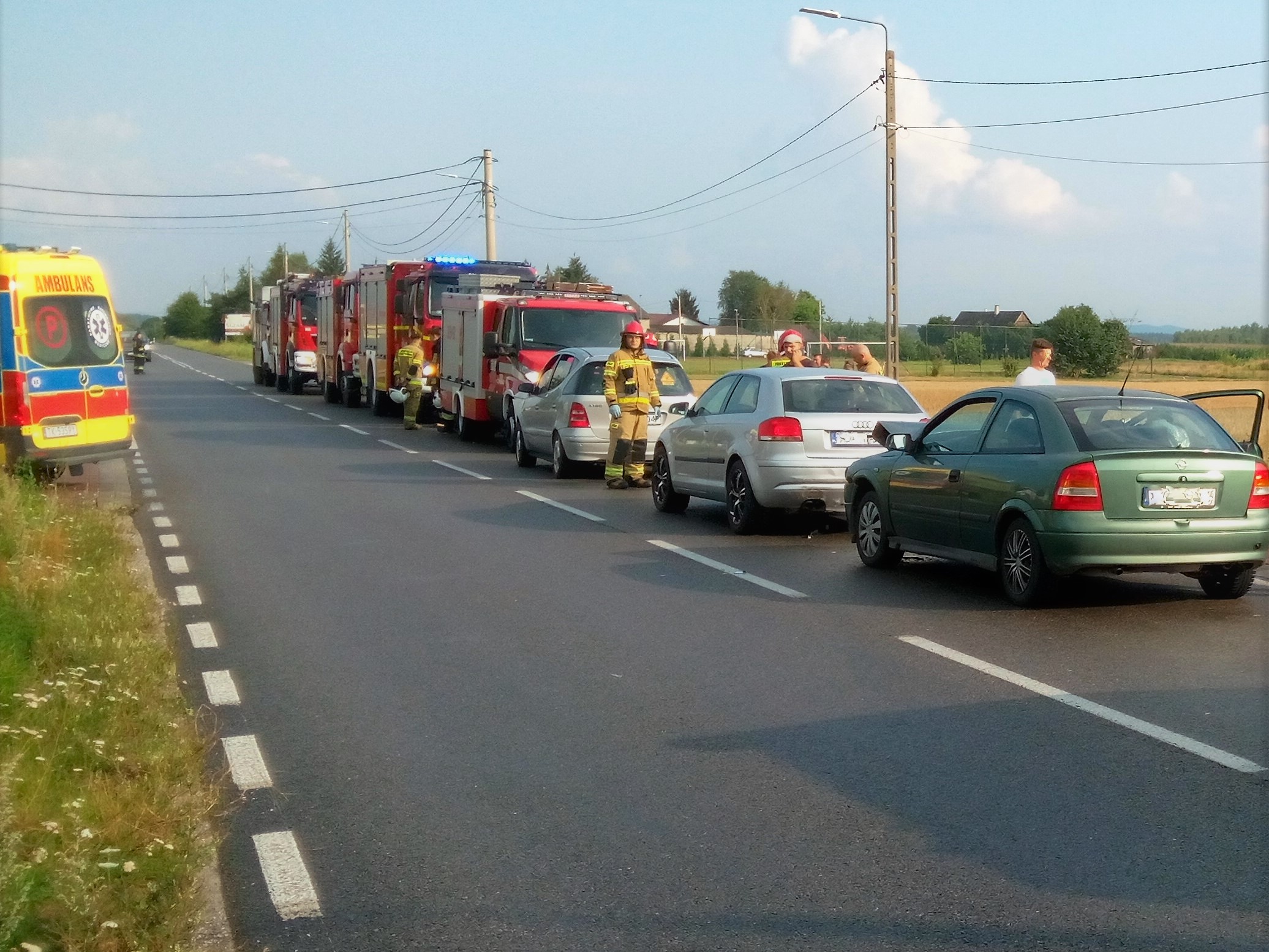 Samochody osobowe: Mercedes, Audi A3 oraz Opel Astra, którymi podróżowało łącznie 8 osób zderzyły się i blokowały pas jezdni w kierunku Kielc. Osoby biorące udział w zdarzeniu opuściły pojazdy samodzielnie, a Zespół Ratownictwa Medycznego po ich przebadaniu podjął decyzję o zabraniu 3 osób z Opla do szpitala. Strażacy zabezpieczyli teren działań służb, odłączyli zasilanie w uszkodzonych autach oraz zakręcili zawór butli LPG w Oplu. Na zakończenie usunęli plamę płynów eksploatacyjnych z jezdni.