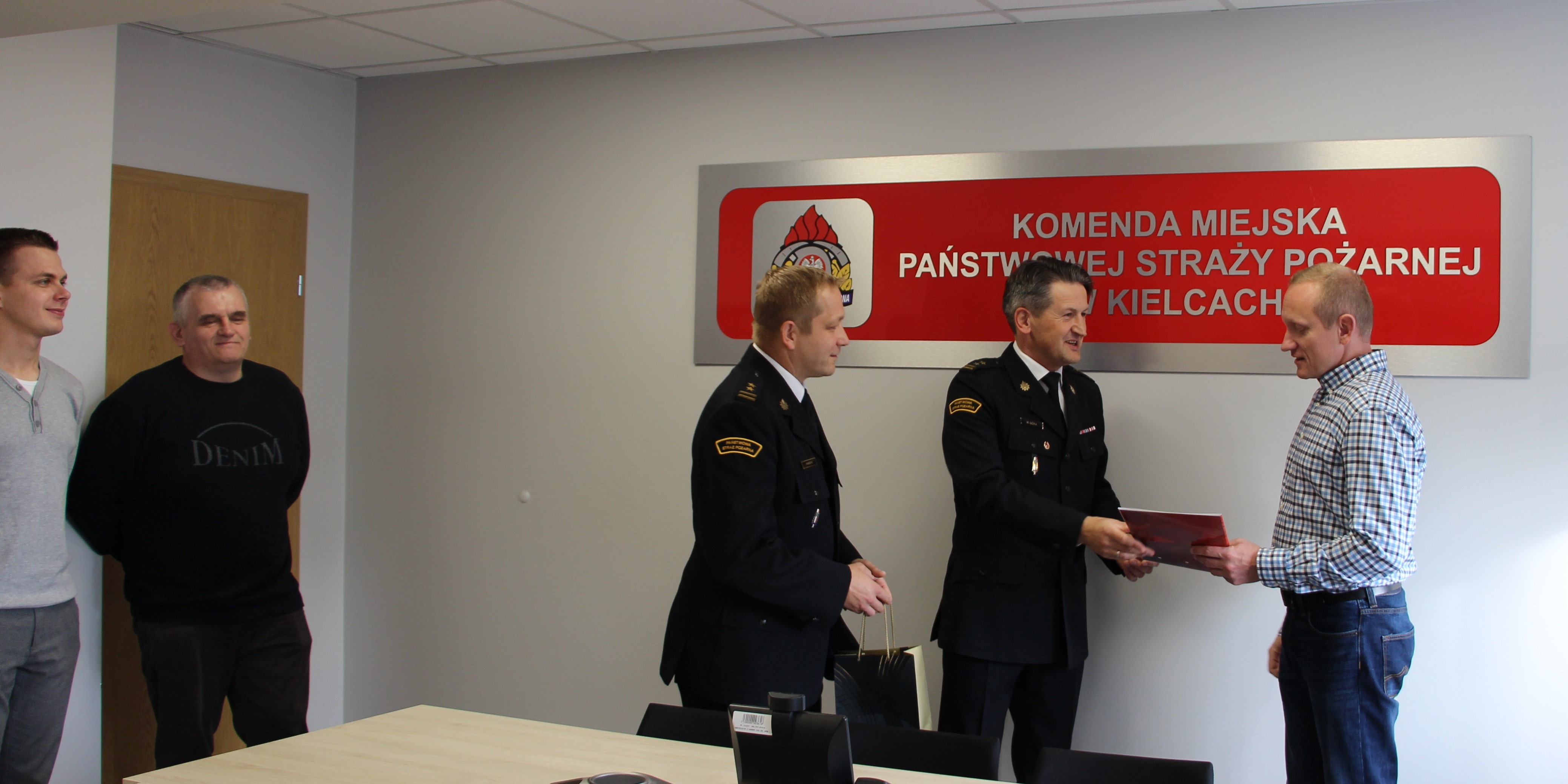 W tym dniu funkcjonariusze i pracownicy cywilni tutejszej komendy zebrali się w sali narad aby pożegnać odchodzącego, wieloletniego współpracownika, który od 1 listopada rozpocznie pracę w Komendzie Wojewódzkiej PSP w Kielcach. Na uroczystym spotkaniu Komendant Miejski Państwowej Straży Pożarnej w Kielcach bryg. Mariusz Góra przedstawił krótko przebieg służby st. kpt. Marcina Pastuszki i wyraził nadzieję, że wiedza zdobyta w czasie wielu lat pracy pozwoli mu dalsze sukcesy. Odchodzący zastępca naczelnika Wydziału Operacyjno-Szkoleniowego podziękował wszystkim współpracownikom za ten wspólny czas. Mimo, że z żalem się z nim rozstajemy to pożegnanie upłynęło w wesołej atmosferze pełnej ciepłych i życzliwych słów. Mamy nadzieję, że nasza współpraca z st. kpt. Marcinem Pastuszką będzie trwała dalej, a jemu samemu wszyscy życzmy satysfakcji z wypełniania nowych obowiązków i samych sukcesów w nowej pracy.