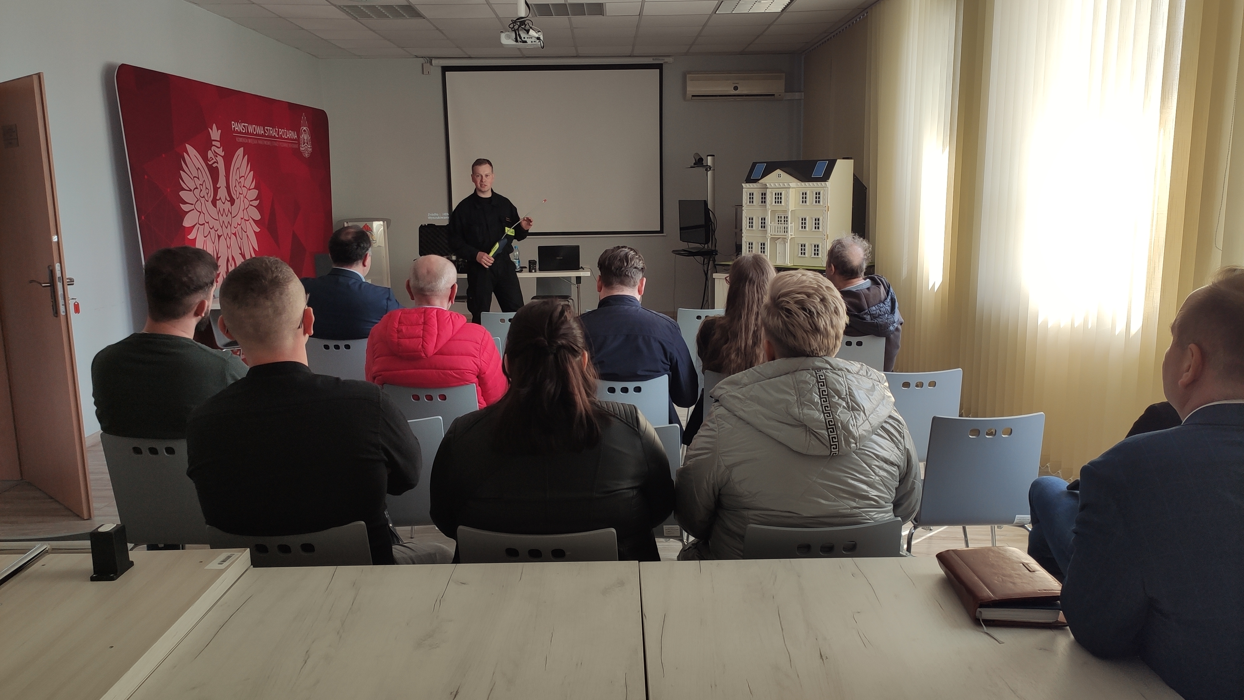 Podczas spotkań Naczelnik Wydziału Kontrolno – Rozpoznawczego st. kpt. Sebastian Andrzejewski przekazał pracownikom zakładów jak zachować się w przypadku powstania pożaru, w tym szczególną uwagę zwrócił na ewakuację z budynku w przypadku zagrożenia.