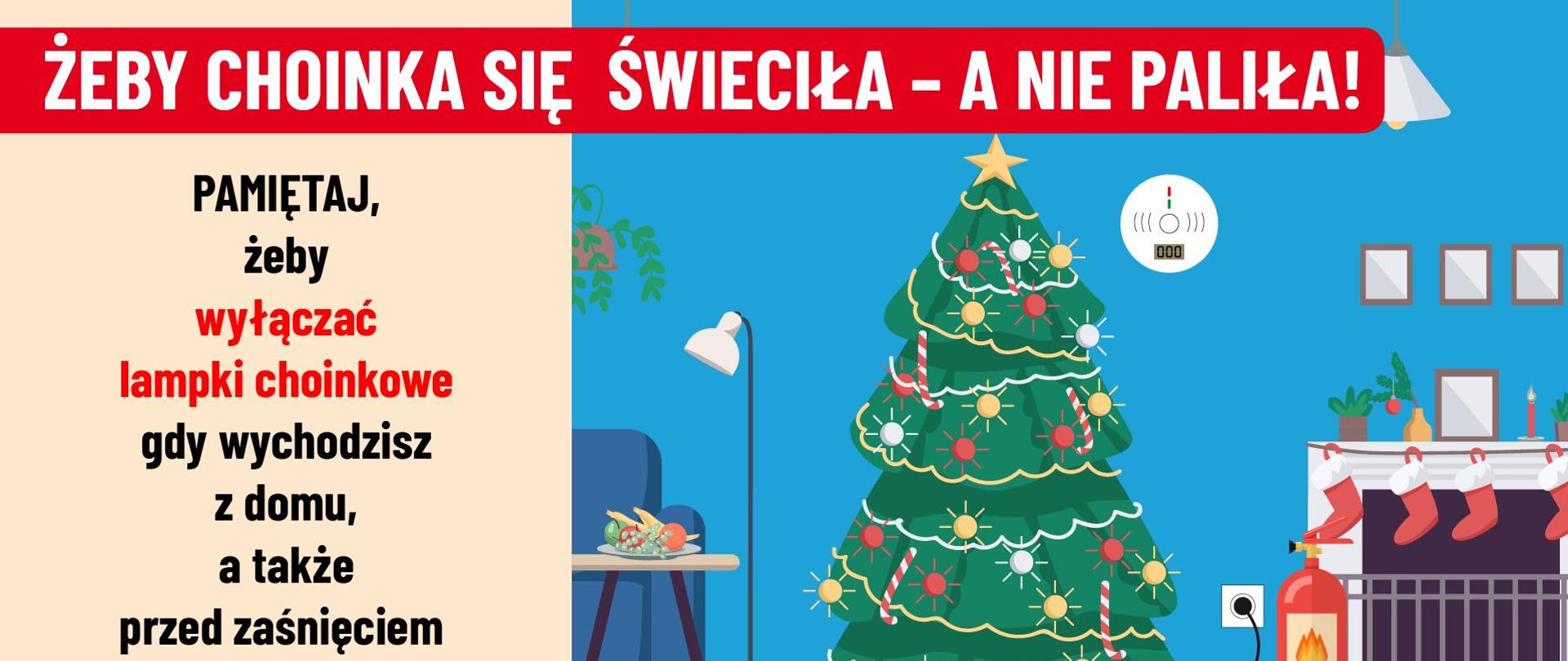 Drzewko choinkowe w domu należy ustawić w bezpiecznej odległości od kominków, pieców, grzejników itp. oraz zasłon i firanek. Zarówno naturalna jak i sztuczna choinka są materiałami łatwopalnymi. Na choinkach nie należy zapalać świeczek palących się otwartym ogniem. Świeczek i świeczników nie należy również ustawiać zbyt blisko choinek i innych materiałów palnych oraz nie dopuszczać do zapalenia się ozdób nałożonych na świeczniki. Pamiętajmy, aby wyłączyć lampki choinkowe, gdy wychodzimy z domu, a także przed zaśnięciem.