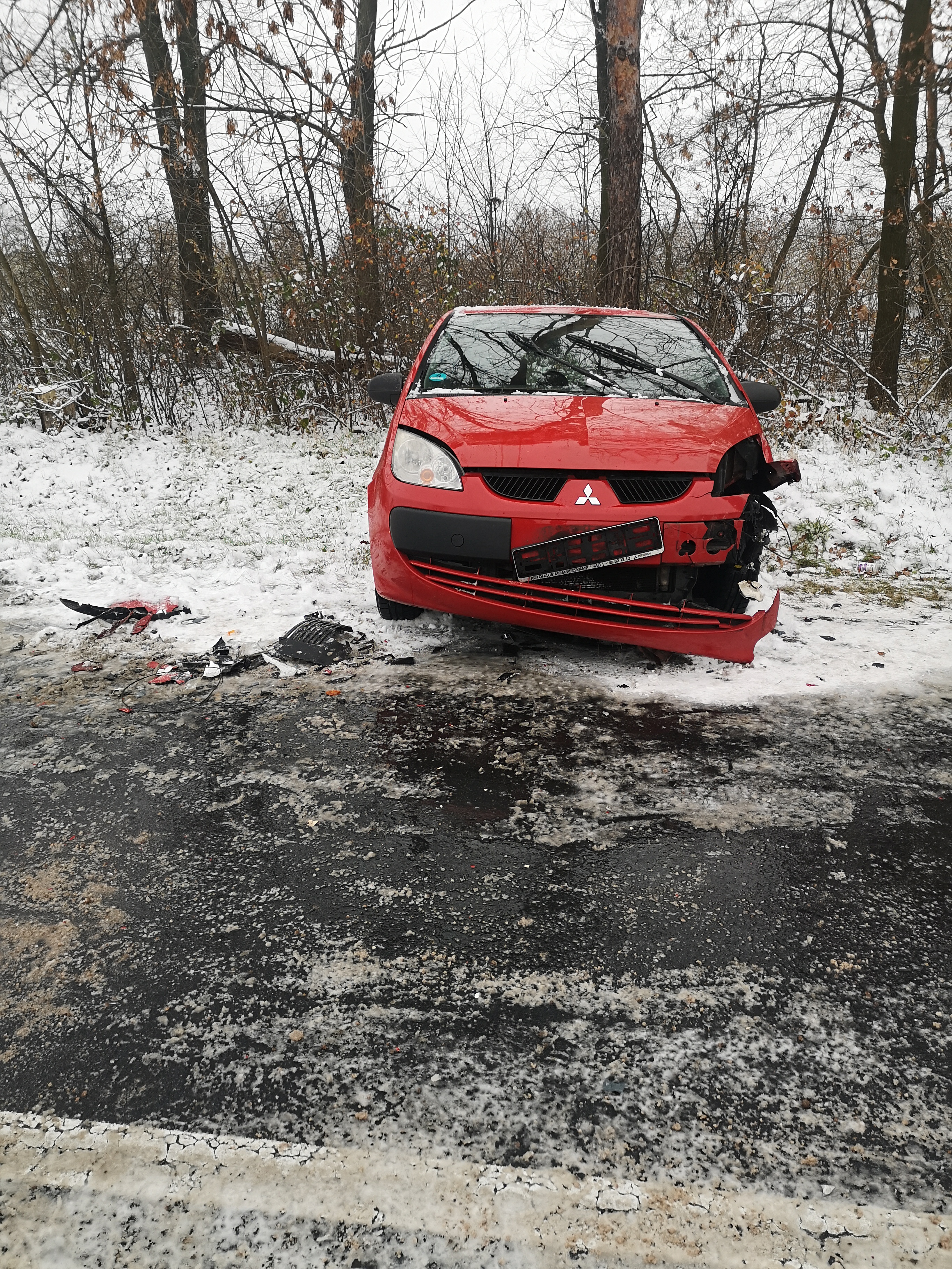 Kilkadziesiąt minut później doszło do trzeciego wypadku. W miejscowości Budy, gmina Krzymów samochód ciężarowy prawdopodobnie wpadł w poślizg, zjechał na pobocze oraz uderzył w barierki ochronne. Ze względu na wyciek paliwa z uszkodzonego zbiornika na miejsce zadysponowano Specjalistyczną Grupę Ratownictwa Chemiczno – Ekologicznego z Jednostki Ratowniczo – Gaśniczej Nr 1 w Koninie. Działania strażaków polegały na zabezpieczeniu miejsca zdarzenia, uszczelnieniu wycieku z jednego zbiornika oraz przepompowaniu paliwa z drugiego zbiornika do zbiorników zastępczych. Powyższe działania ograniczyły zanieczyszczenie gleby olejem napędowym.