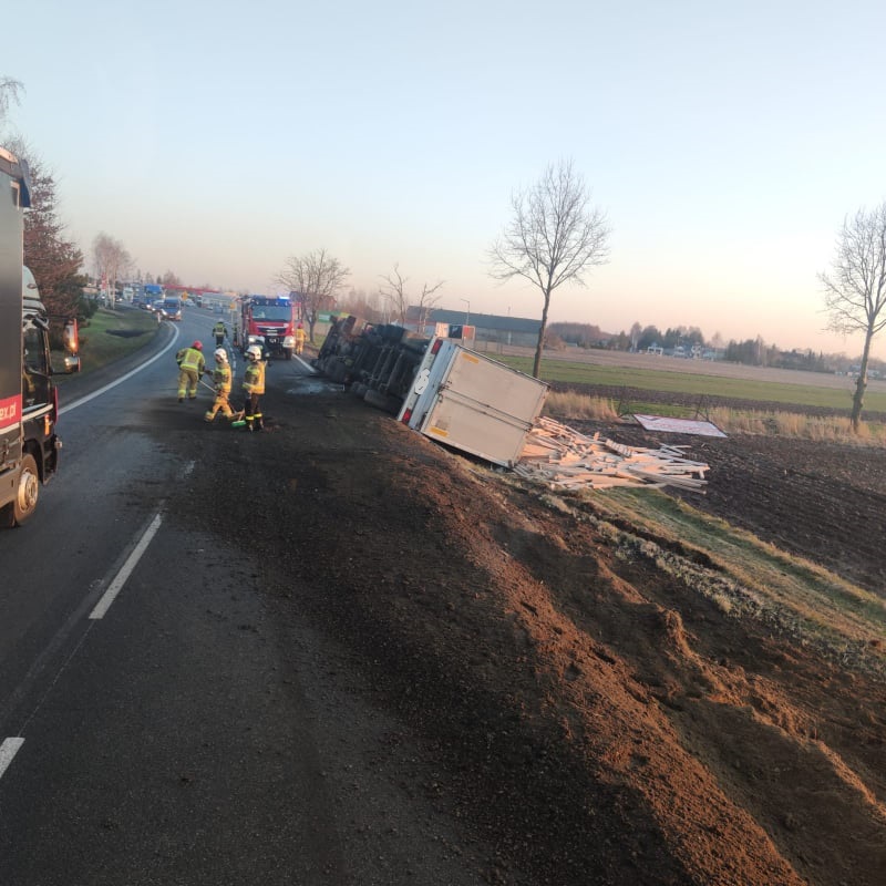 a cześć przewożonego towaru rozsypała się na pole. Działania strażaków polegały na zabezpieczeniu miejsca zdarzenia oraz udzieleniu kwalifikowanej pierwszej pomocy kierowcy samochodu ciężarowego, który następnie został przekazany Zespołowi Ratownictwa Medycznego.