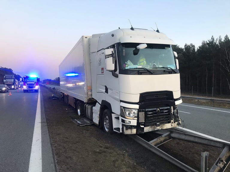 Zgłoszenie o pierwszym wypadku wpłynęło do Stanowiska Kierowania Komendanta Miejskiego PSP w Koninie po godz. 16.00. Na 248 km Autostrady A2 samochód ciężarowy uderzył w barierki energochłonne. Kierowca opuścił pojazd o własnych siłach przed przybyciem strażaków i nie wymagał udzielenia pomocy. Ze względu na uszkodzenie zbiorników z olejem napędowym w samochodzie ciężarowym na miejsce zadysponowano Specjalistyczną Grupę Ratownictwa Chemiczno – Ekologicznego z Jednostki Ratowniczo – Gaśniczej Nr 1 w Koninie.
