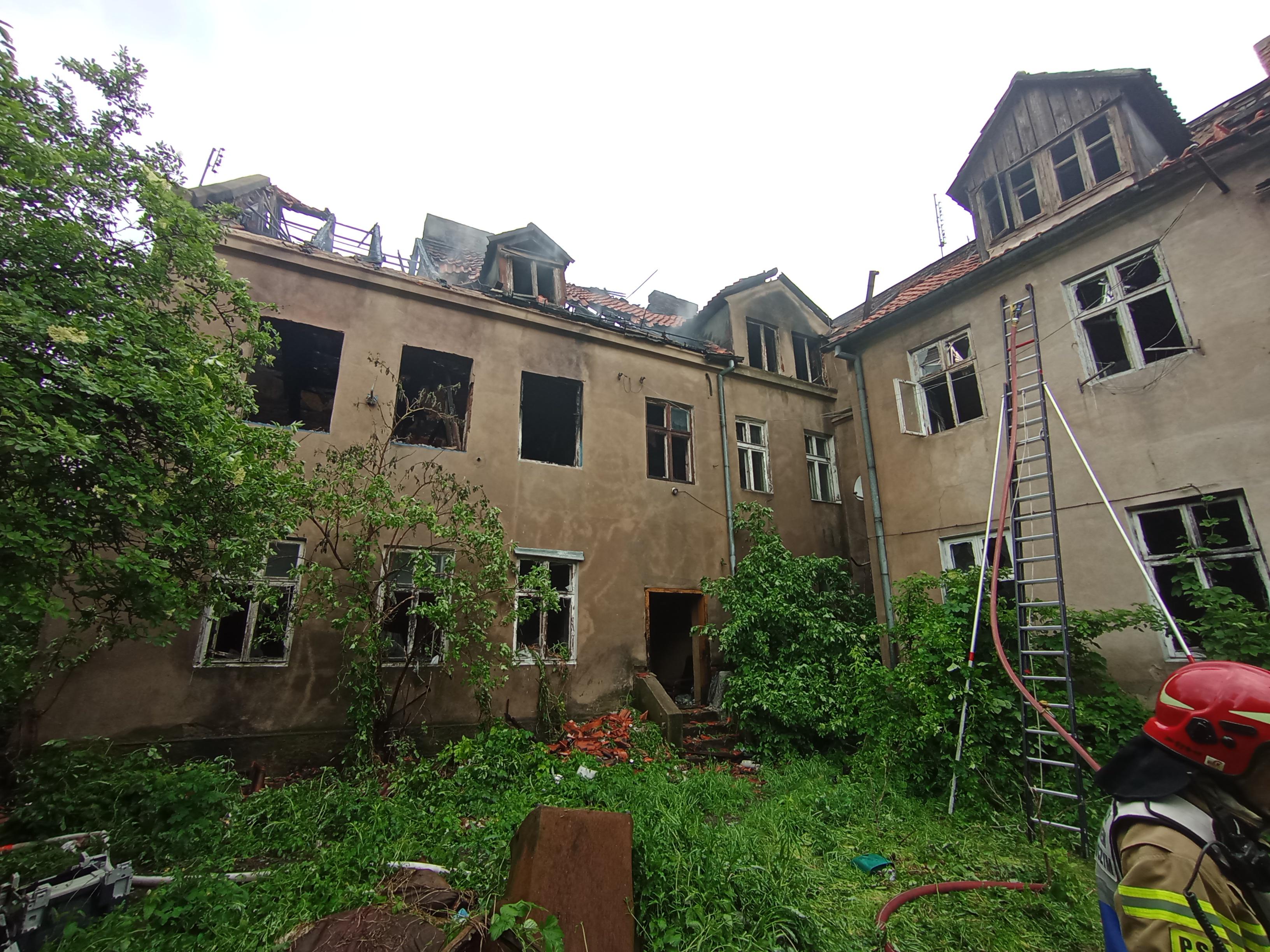 Po przybyciu na miejsce zdarzenia stwierdzono wydobywający się dym z poddasza niezamieszkałego i częściowo zniszczonego budynku kamienicy. Pożar wydobywał się częściowo