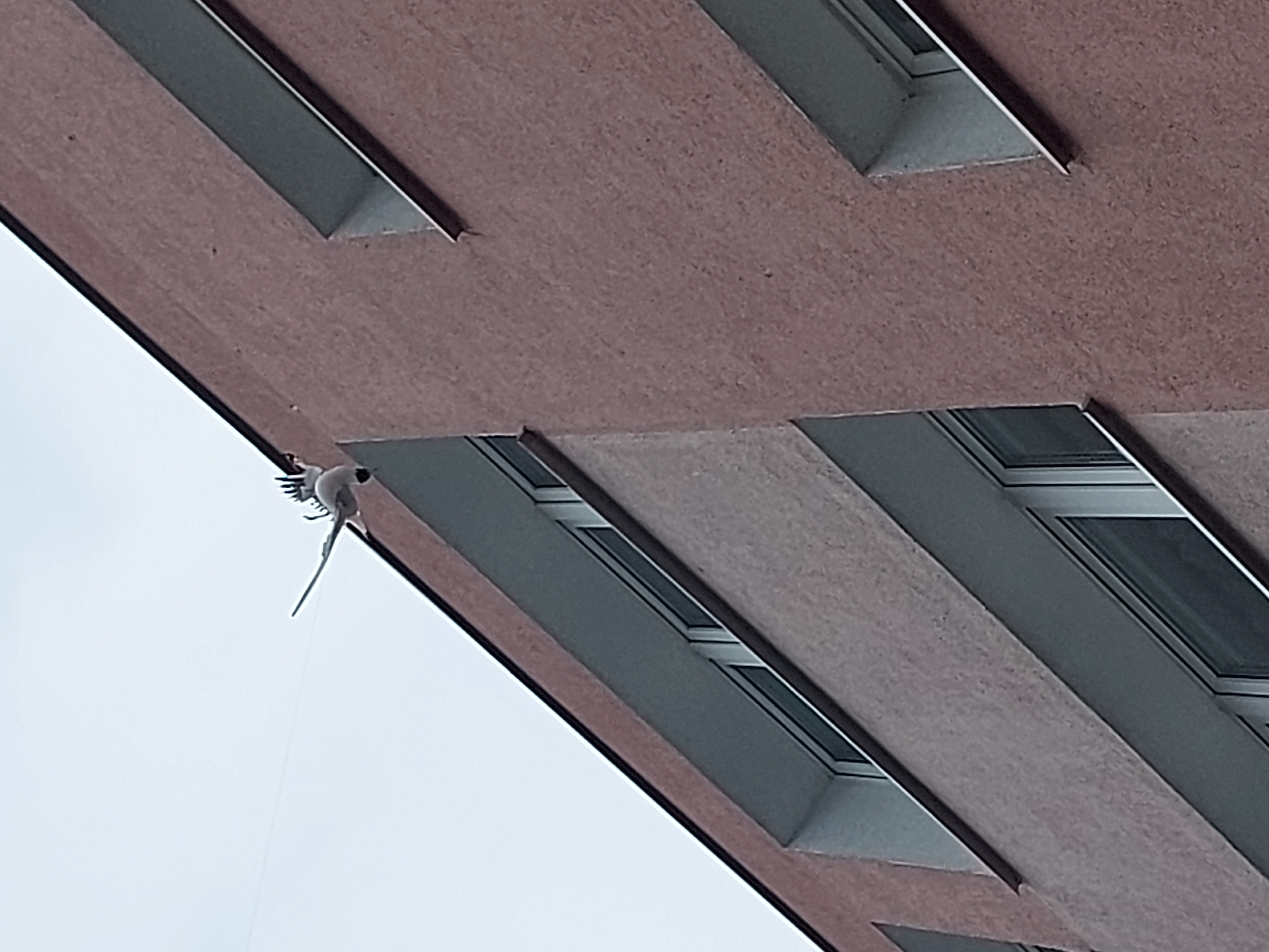 Po przybyciu na miejsce stwierdzono, że przed oknem jednego z mieszkań budynku wielorodzinnego, na wysokości 4 piętra zaplątał się ptak o sznurek.