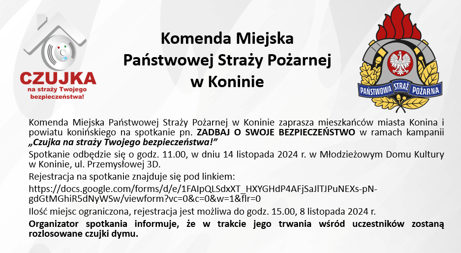 Konińscy strażacy zapraszają mieszkańców miasta Konina i powiatu konińskiego na spotkanie pn. ZADBAJ O SWOJE BEZPIECZEŃSTWO w ramach ogólnopolskiej kampanii edukacyjno-informacyjnej Czujka na straży Twojego bezpieczeństwa!