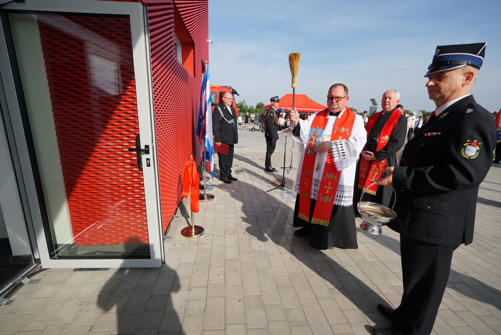 Dalsza część uroczystości rozpoczęła się przed budynkiem nowej remizy OSP od złożenia meldunku przez dowódcę uroczystości mł. bryg. Piotra Szafrańskiego Wielkopolskiemu Komendantowi Wojewódzkiemu PSP nadbryg. Dariuszowi Matczakowi. Następnie dokonano uroczystego przecięcia wstęgi i poświęcenia nowej strażnicy OSP w Kazimierzu Biskupim.