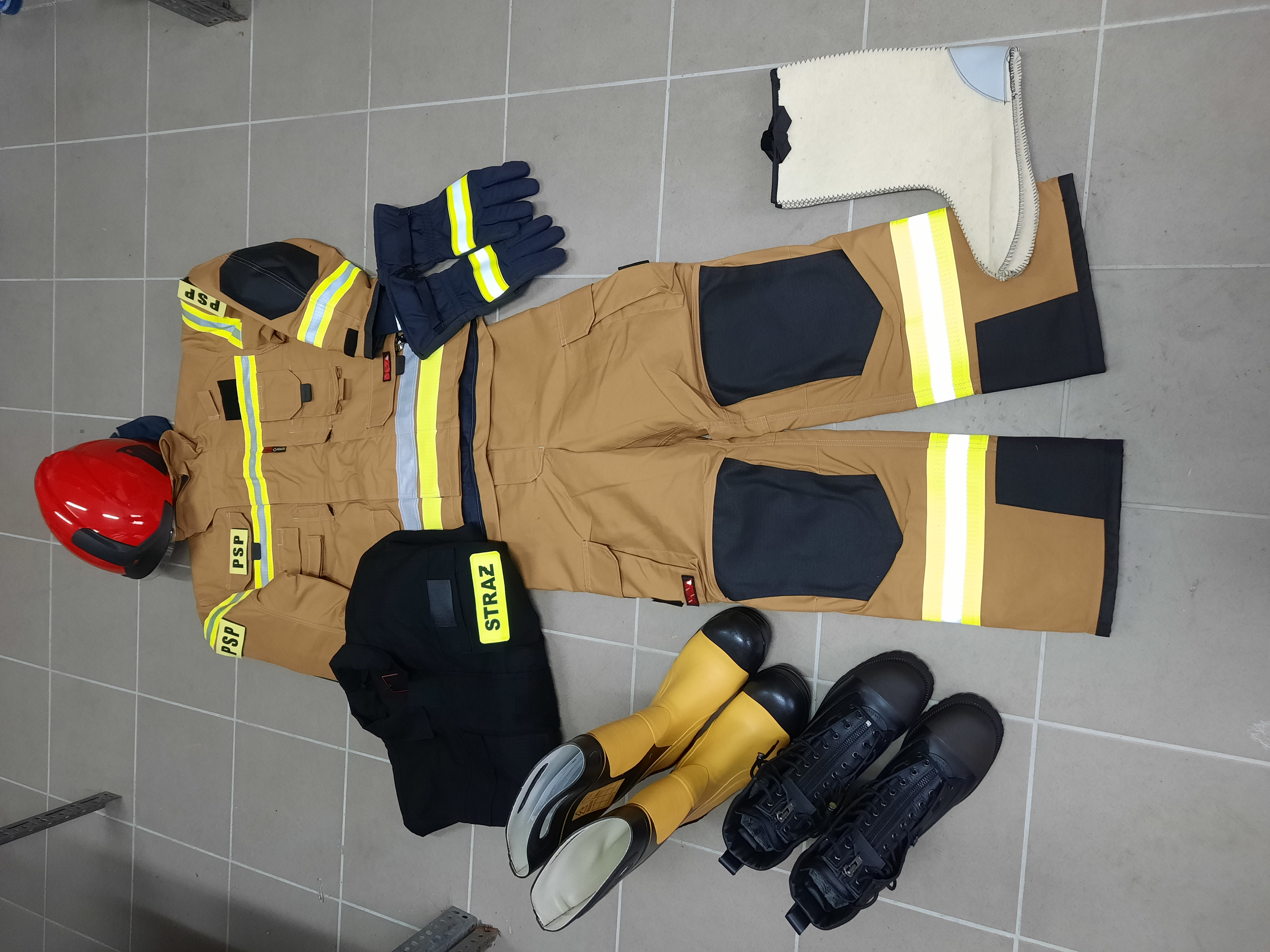 - środki ochrony indywidualnej strażaka m.in.: buty specjalne, hełmy, ubrania koszarowe, kominiarki,