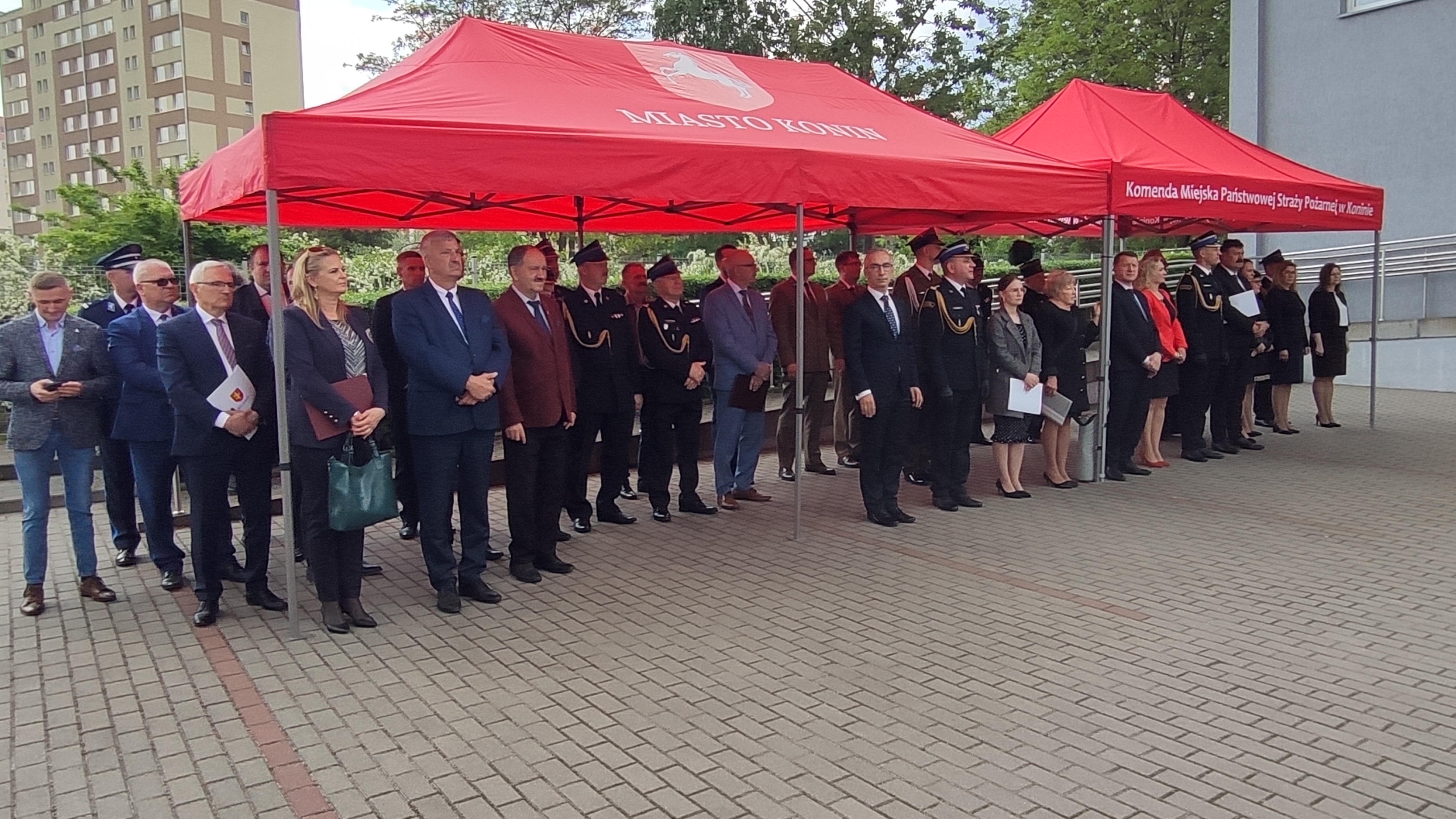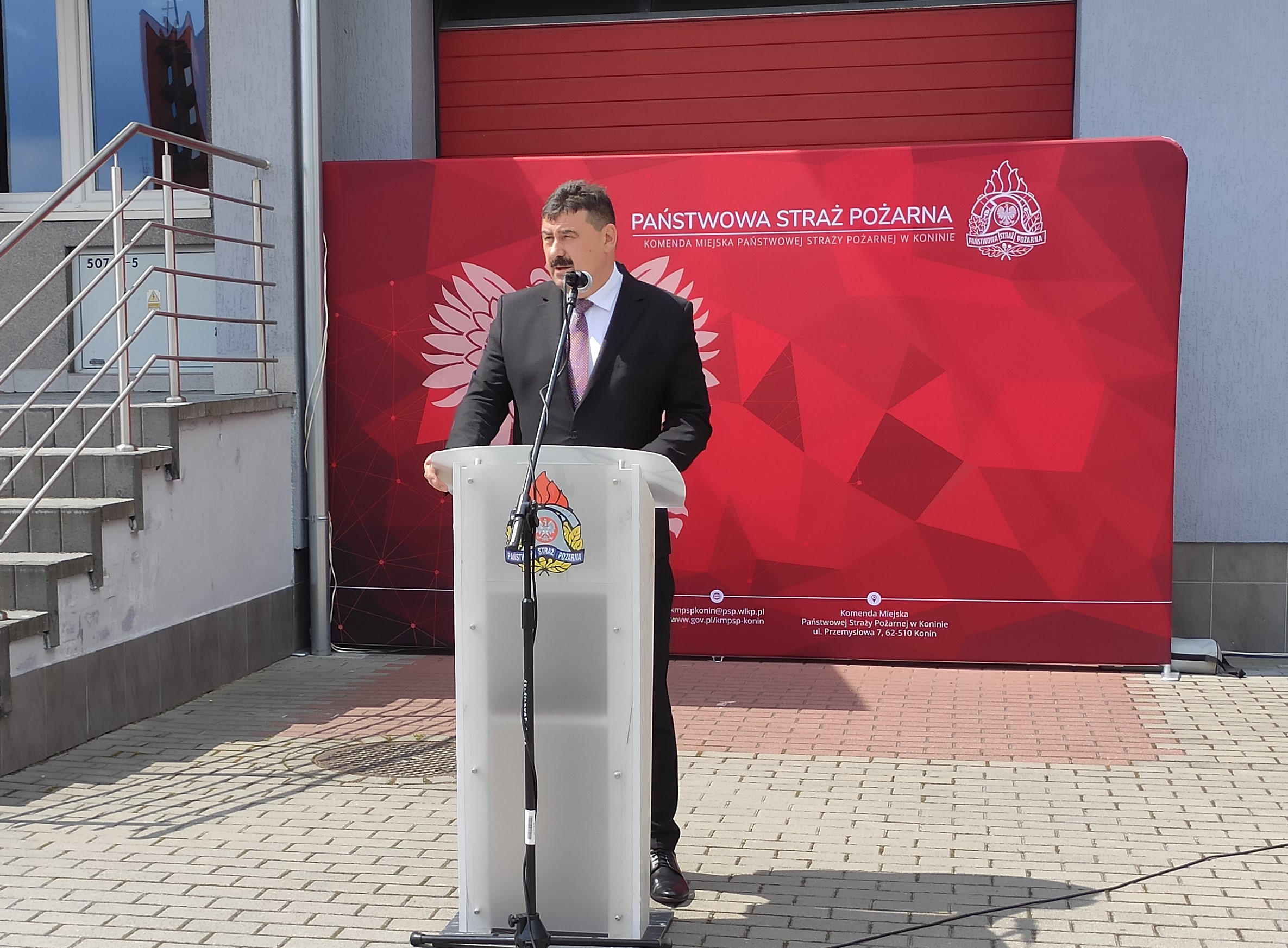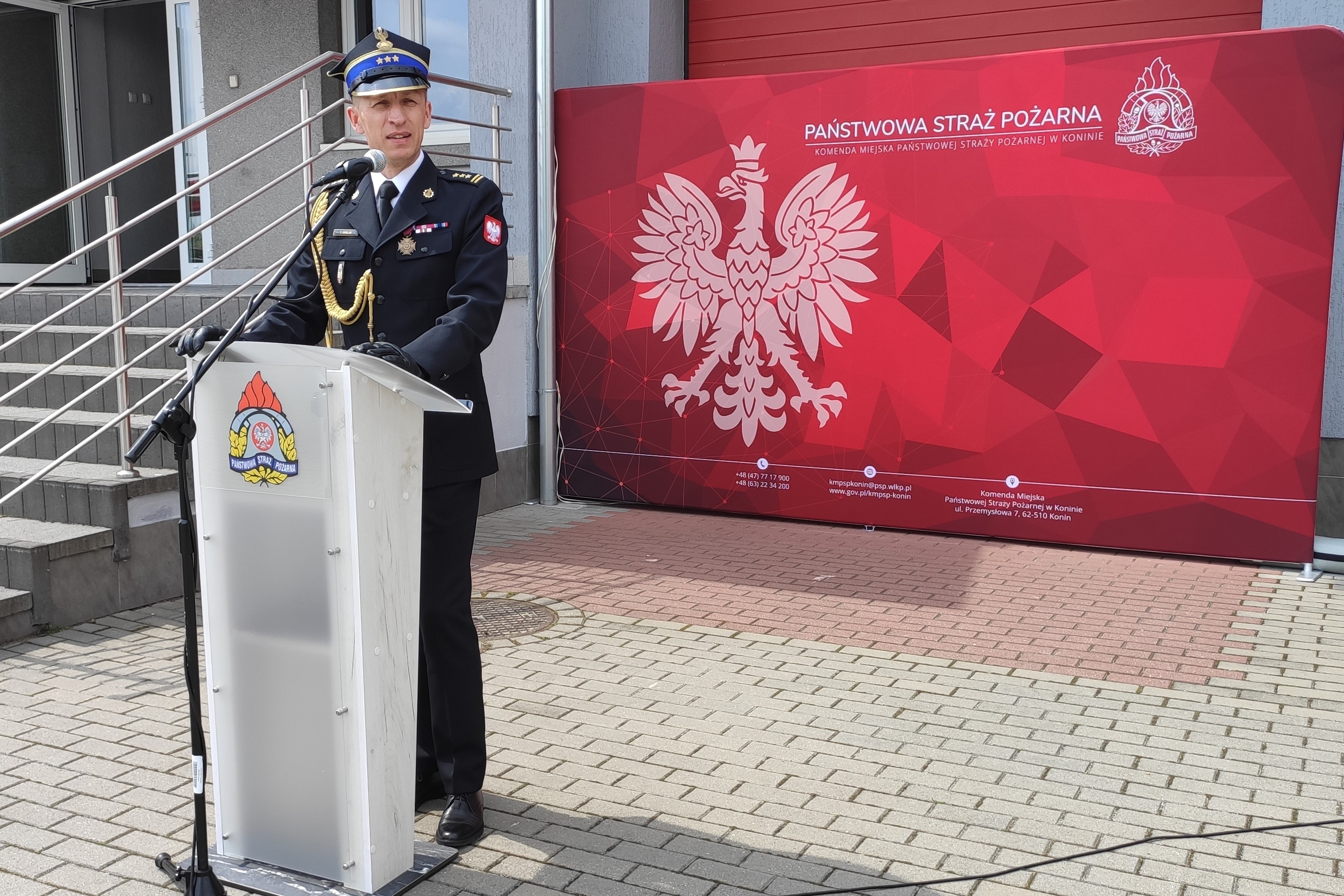 Po Mszy Świętej na placu przed Komendą Miejską PSP w Koninie st. bryg. Maciej Pilarski Komendant Miejski Państwowej Straży Pożarnej w Koninie przywitał przybyłych na uroczystość gości, podziękował władzom państwowym i samorządowym oraz instytucjom