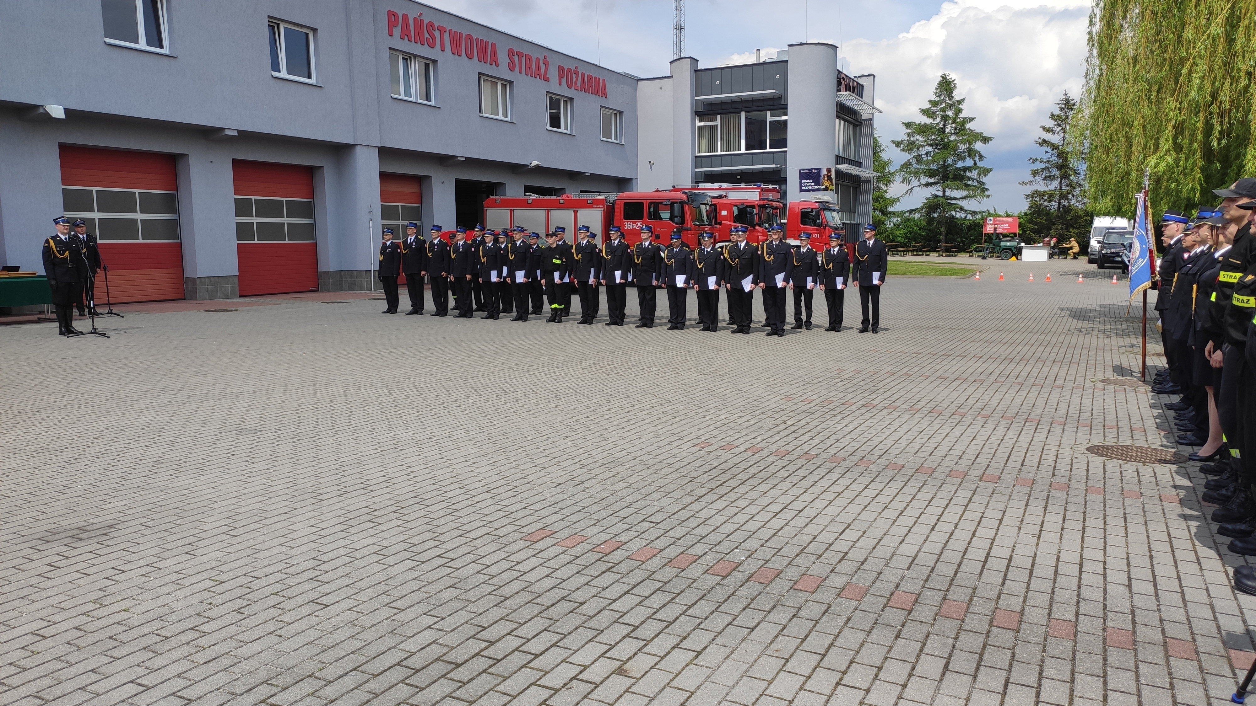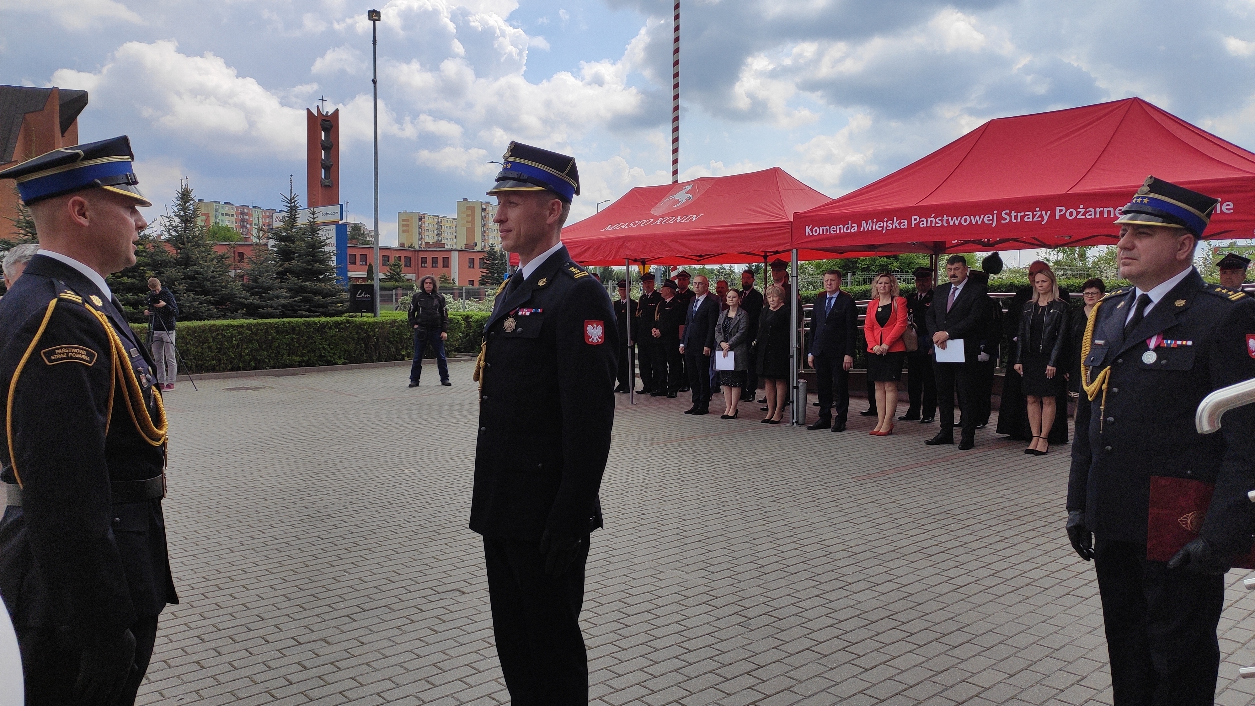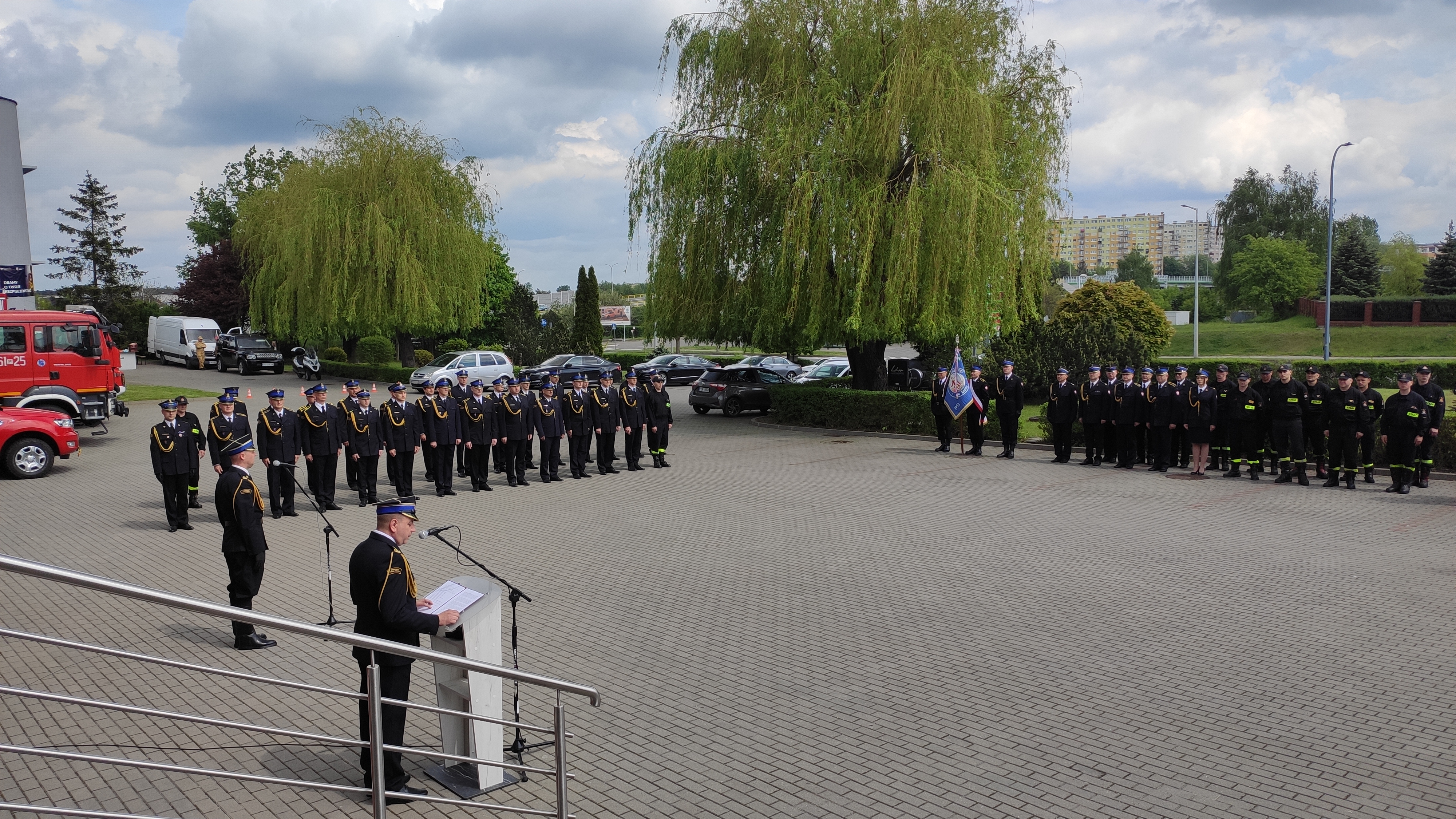 Po Mszy Świętej na placu przed Komendą Miejską PSP w Koninie st. bryg. Maciej Pilarski Komendant Miejski Państwowej Straży Pożarnej w Koninie przywitał przybyłych na uroczystość gości, podziękował władzom państwowym i samorządowym oraz instytucjom