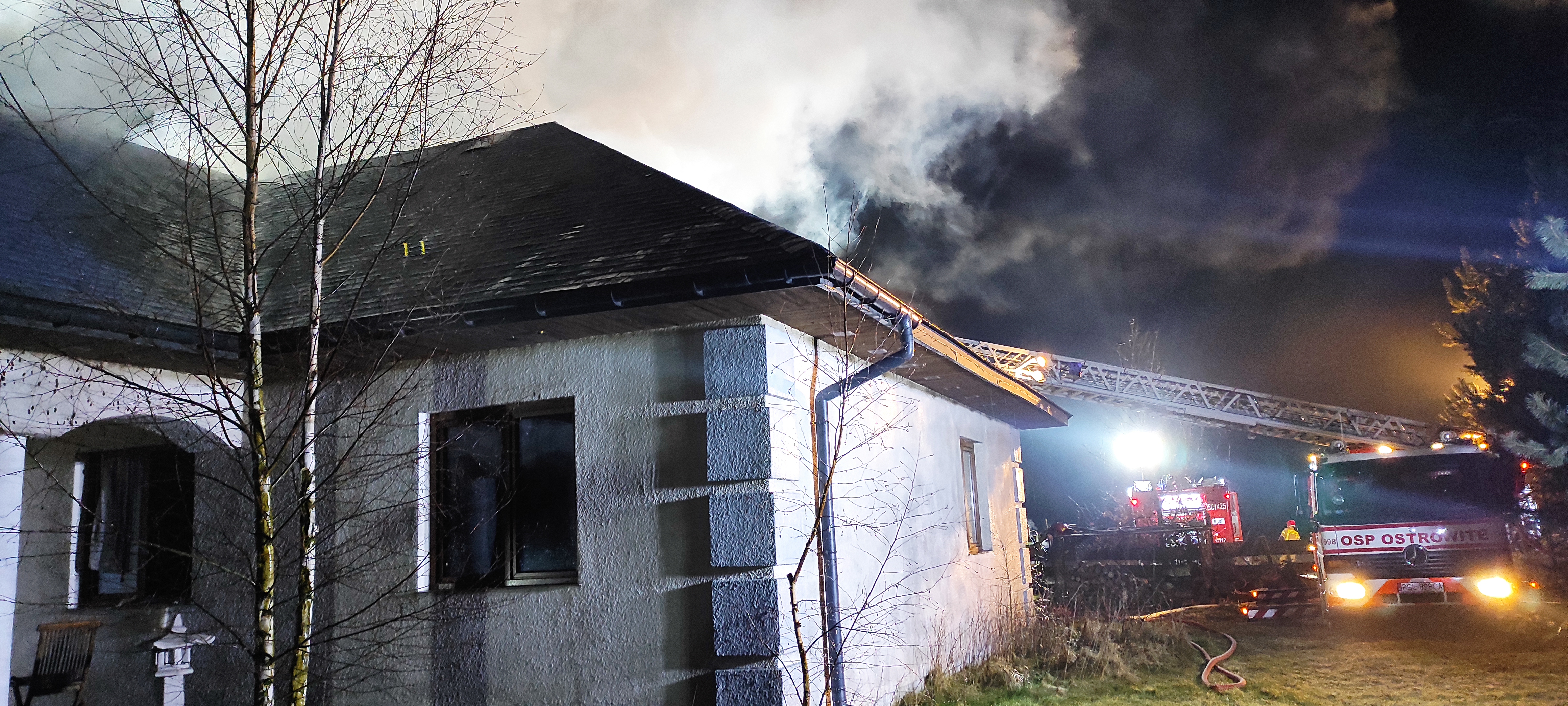 Po przybyciu na miejsce stwierdzono wydobywający się dym z poddasza budynku mieszkalnego jednorodzinnego. Właściciel opuścił budynek przed przybyciem strażaków oraz odłączył prąd od budynku.