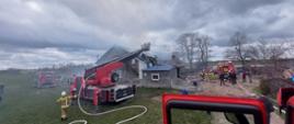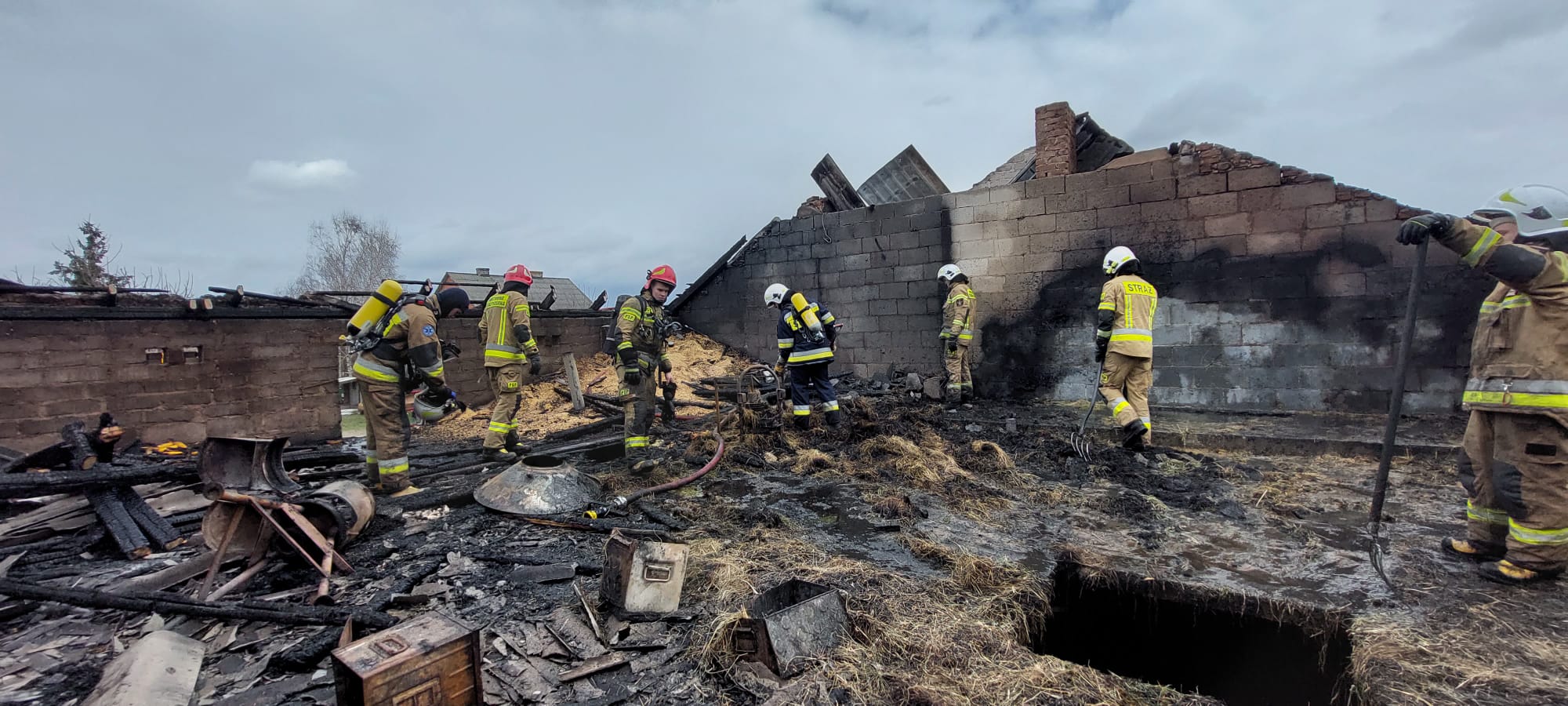 Strażacy zabezpieczeni w sprzęt ochrony układu oddechowego podali wodę na palący się budynek oraz magazynowaną słomę i siano. W dalszej kolejności przystąpiono do rozbiórki dachu oraz dogaszania tlących się elementów. Ze względu na złe samopoczucie udzielono kwalifikowanej pierwszej pomocy właścicielowi budynku, który następnie został przetransportowany do szpitala przez Zespół Ratownictwa Medycznego.