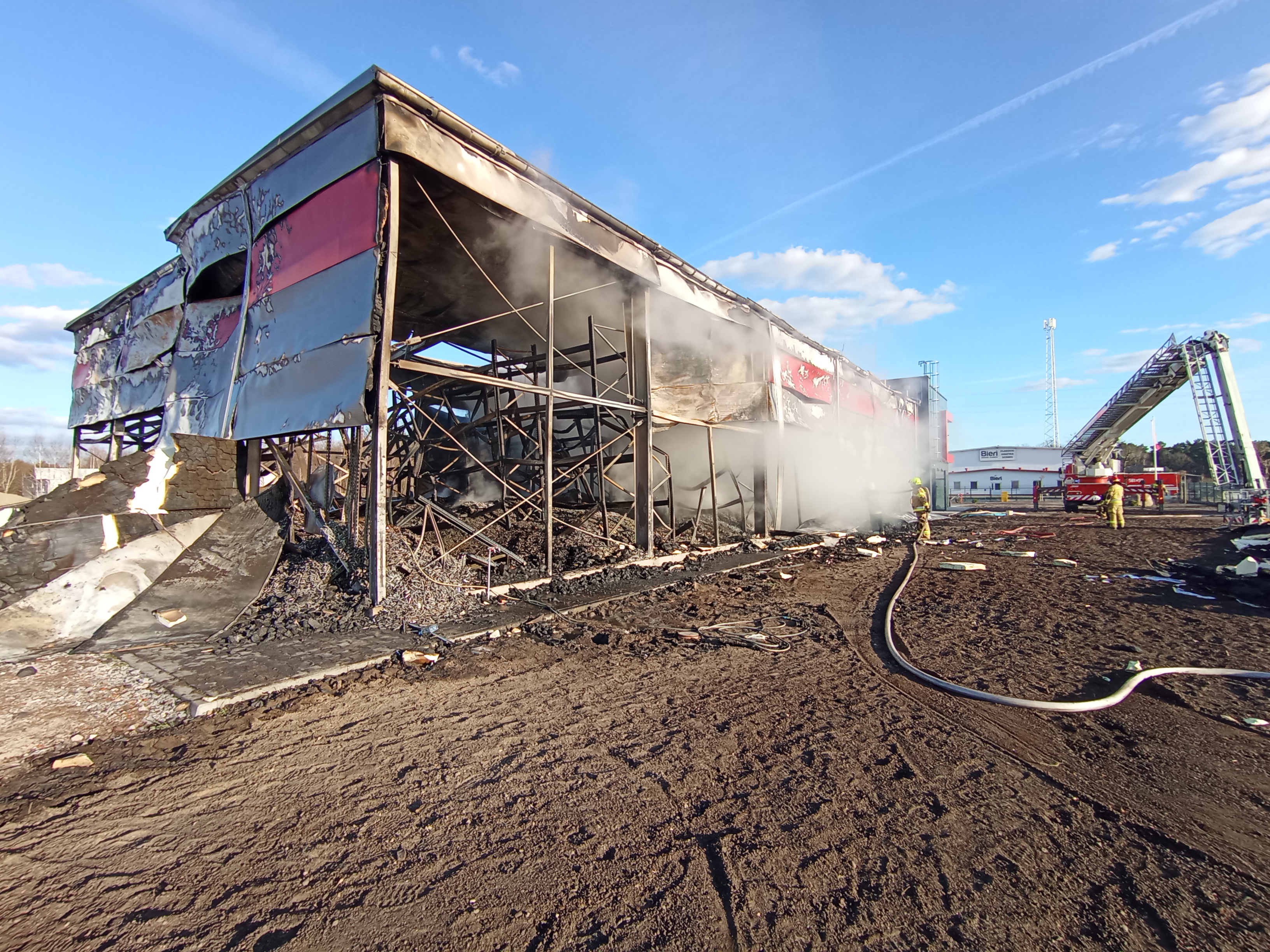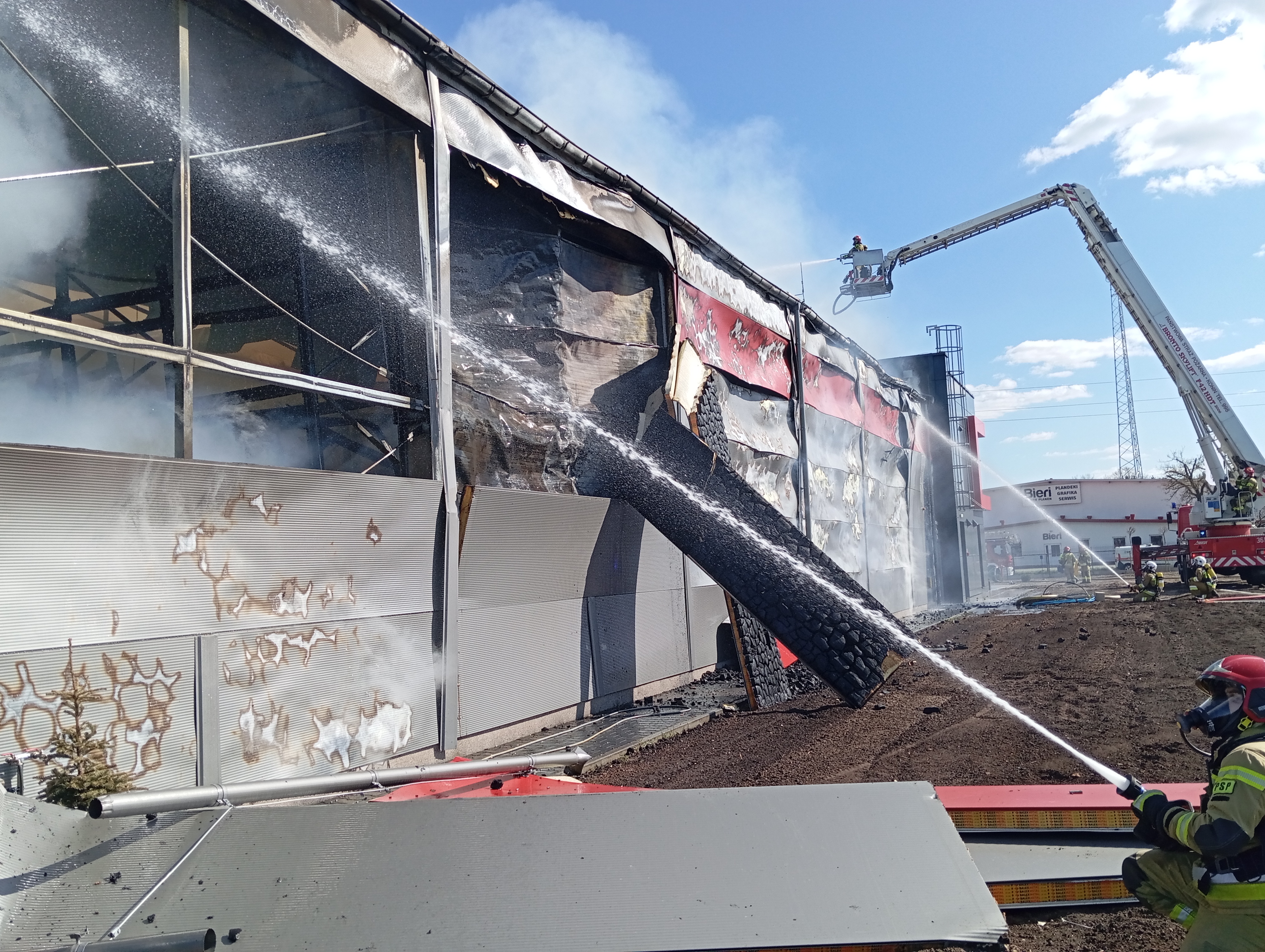 Na miejsce dotarły również Pogotowie Gazowe i Pogotowie Energetyczne, które odłączyły media od budynku. Po dojeździe kolejnych sił i środków podano kolejne prądy wody na palący się budynek. W celu dotarcia do miejsca pożaru przystąpiono do częściowego demontażu płyt warstwowych, co pozwoliło na całkowite ugaszenie zarzewi ognia.