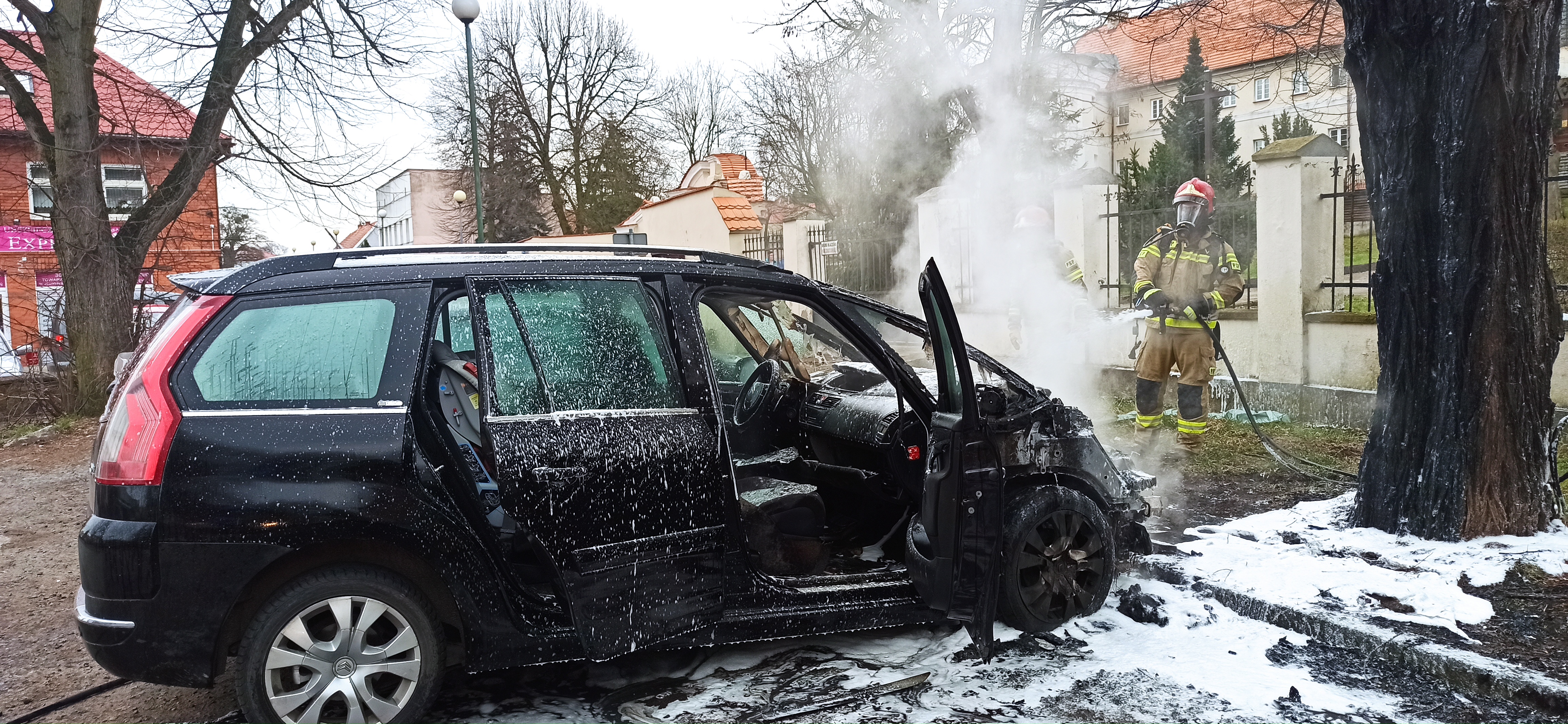 Po przybyciu na miejsce zastano pożar komory silnika oraz deski rozdzielczej samochodu osobowego marki Citroen. Ponadto pożar stwarzał zagrożenie dla zaparkowanego obok samochodu marki VW.
