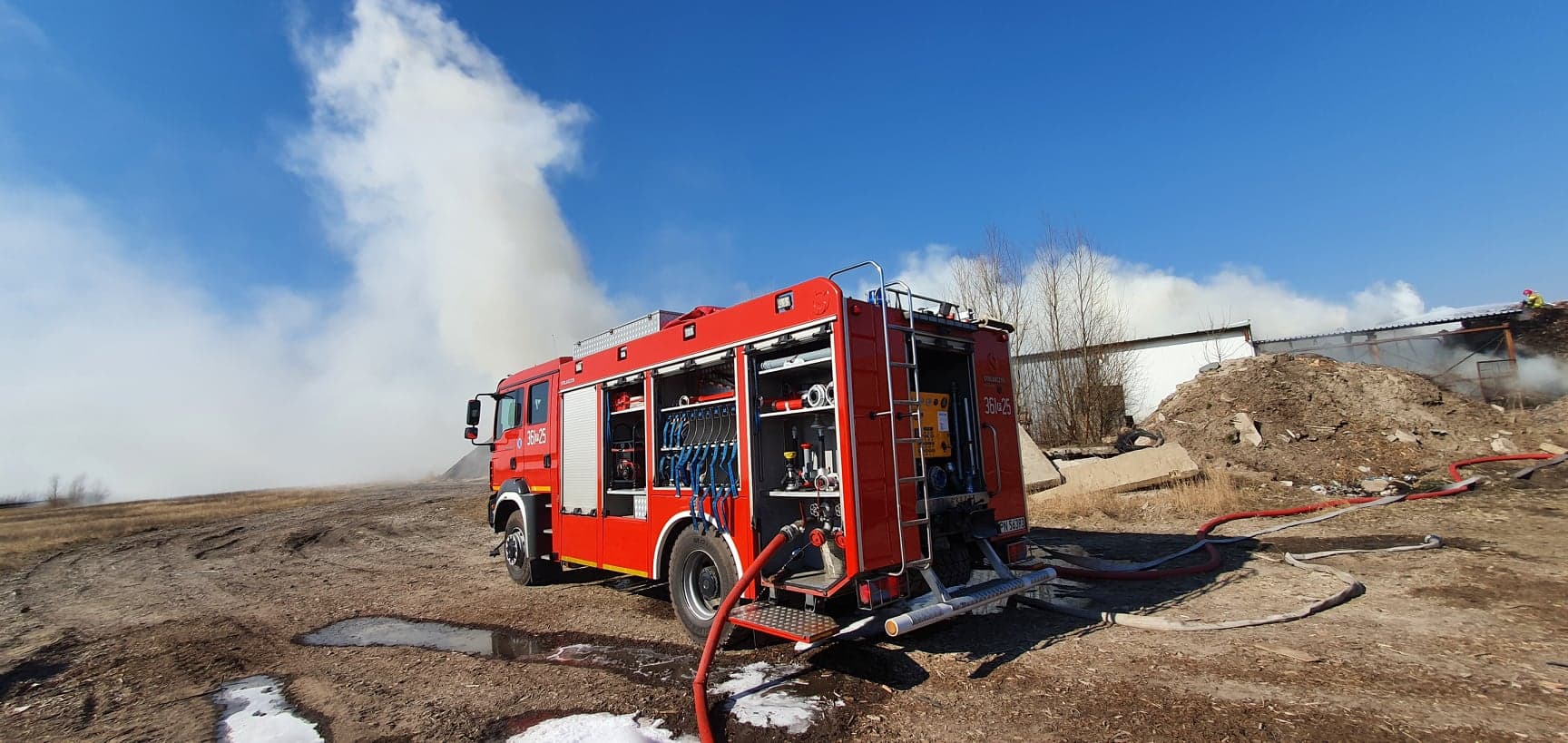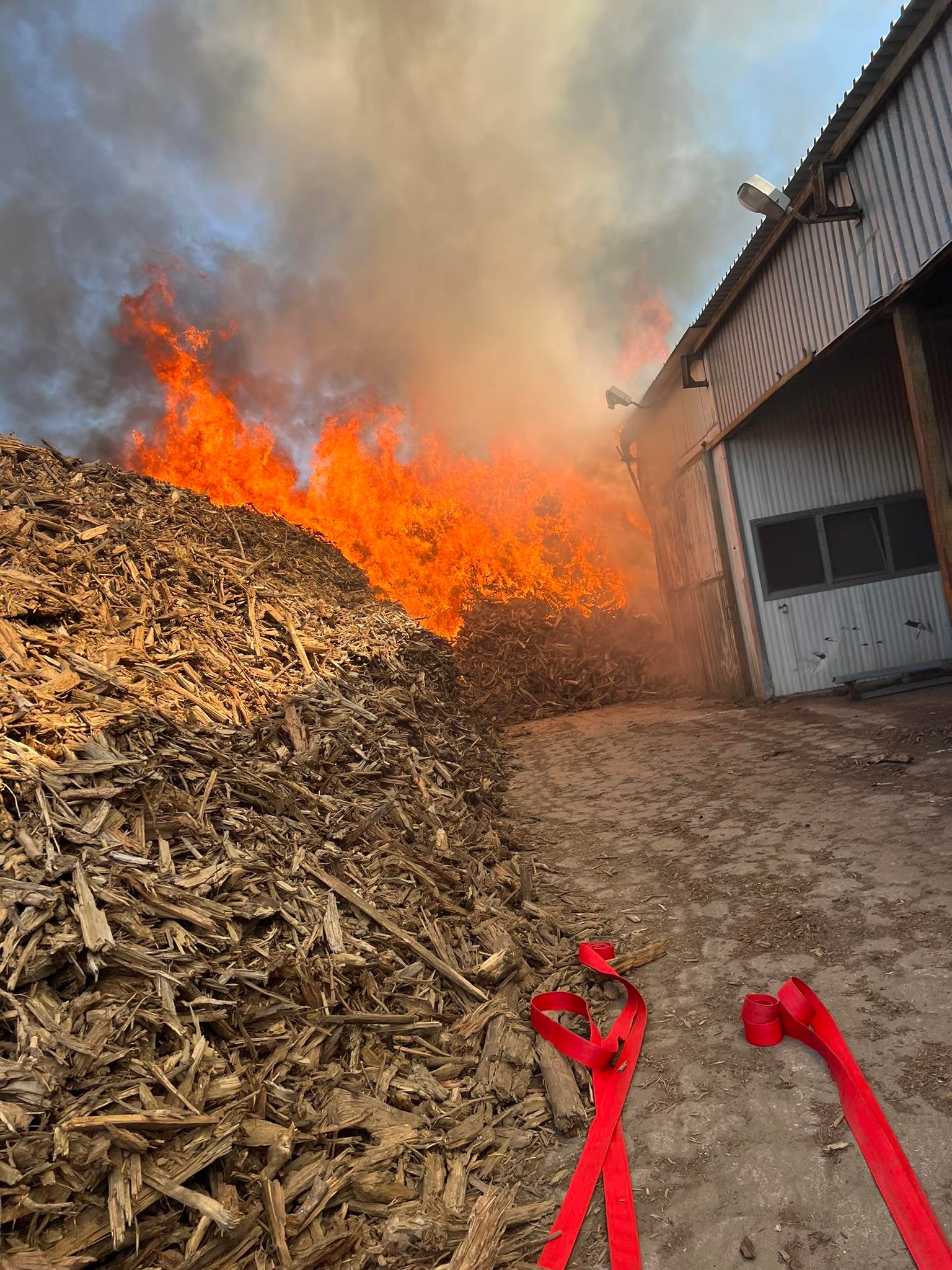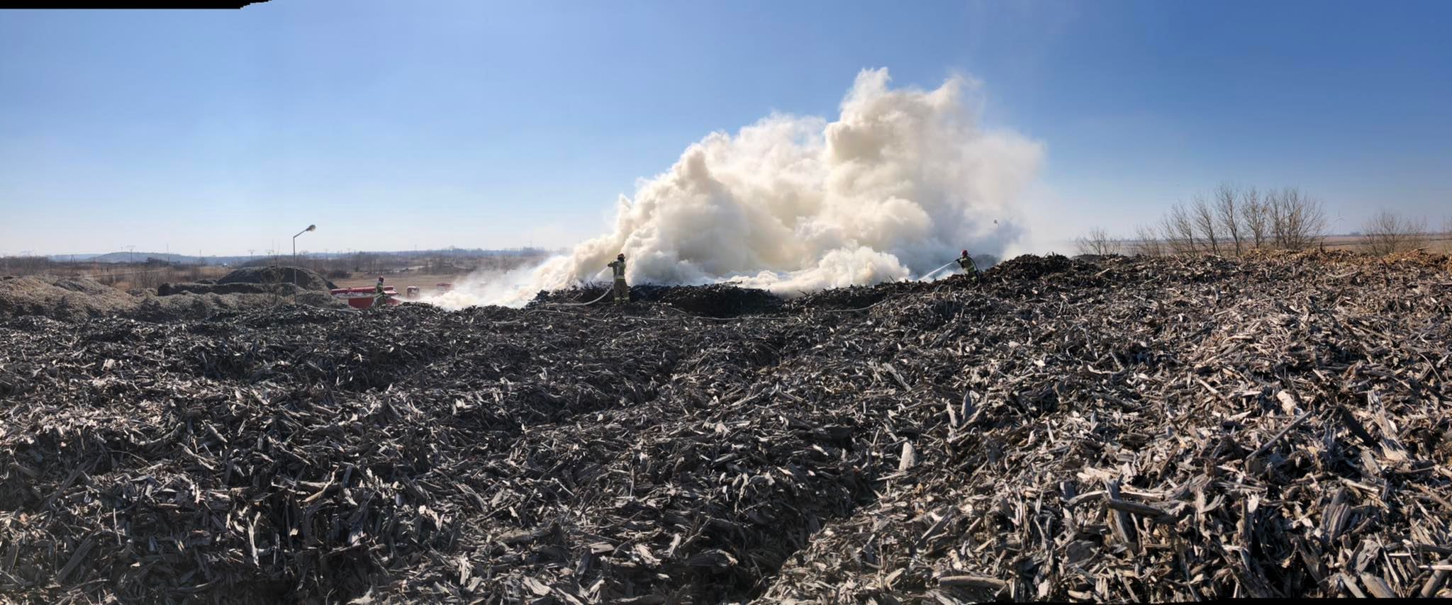 Po przybyciu na miejsce zdarzenia stwierdzono pożar hałdy zrębek drzewa i trocin, panowało silne zadymienie oraz widoczne były płomienie w górnej części składowiska.