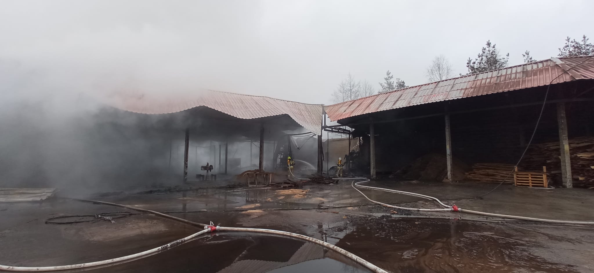 Po przybyciu na miejsce zdarzenia stwierdzono całkowicie objęty pożarem budynek hali przeznaczonej do produkcji peletu. Do budynku przylegała wiata oraz suszarnia drewna.