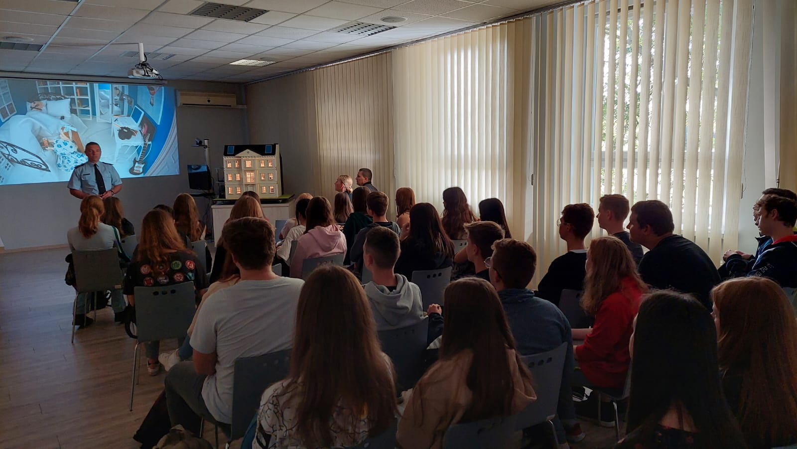 Przy użyciu inteligentnego modelu domku jednorodzinnego zaprezentowano rożnego rodzaju zagrożenia pożarowe i inne niebezpieczne zdarzenia, które mogą wystąpić w naszych domach jednorodzinnych np. pożar oleju na patelni w kuchni, pożar w kotłowni czy też zwarcie instalacji elektrycznej.
