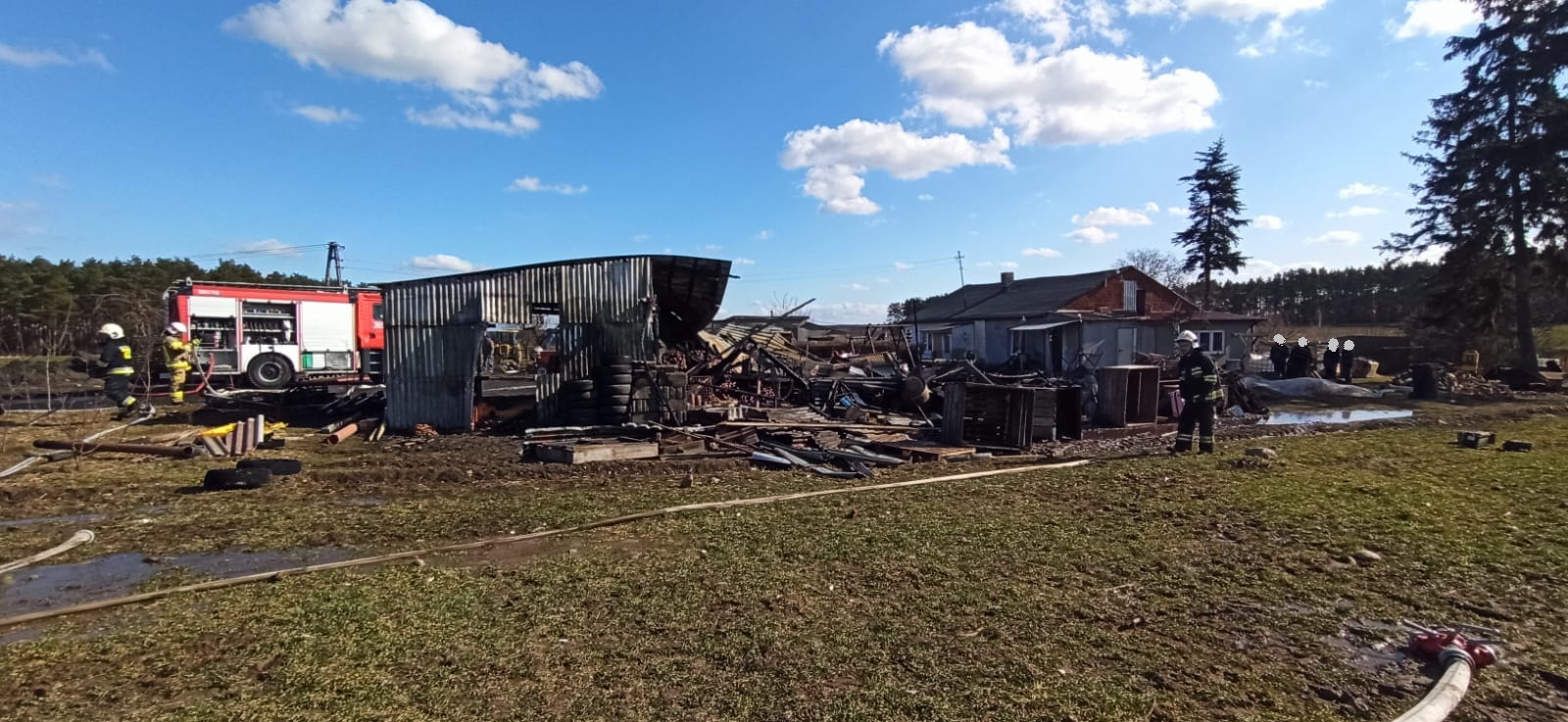 Całkowitemu spaleniu uległ garaż wraz z wyposażeniem oraz wózkiem widłowym.