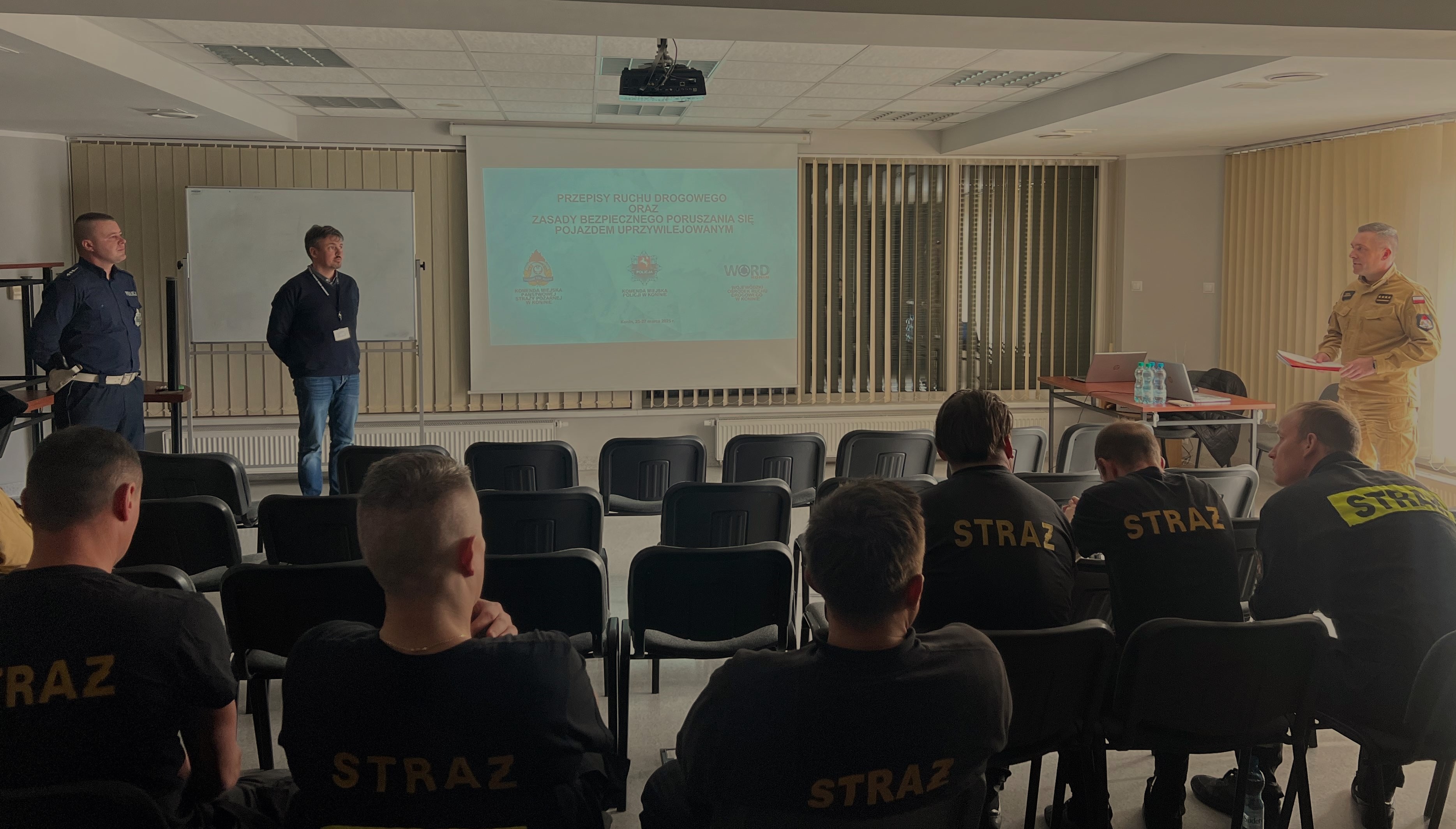 Spotkanie dotyczące przestrzegania zasad bezpieczeństwa i przepisów ruchu drogowego podczas poruszania się pojazdem uprzywilejowanym