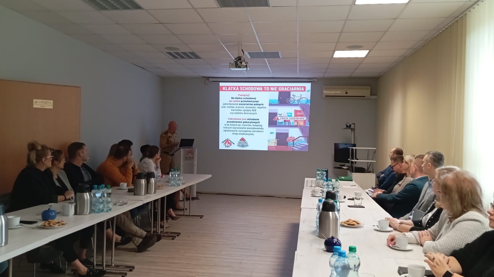 Podczas spotkania omówione zostały zagadnienia dot. ochrony przeciwpożarowej w budynkach mieszkalnych wielorodzinnych, w tym m. in. zakaz składowania materiałów palnych na drogach komunikacji ogólnej służących ewakuacji oraz w pomieszczeniach technicznych, na nieużytkowych poddaszach i strychach. Ponadto poruszono również zagadnienia w zakresie zakazu przechowywania materiałów niebezpiecznych pożarowo w pomieszczeniach piwnicznych, na poddaszach i strychach, w obrębie klatek schodowych i korytarzy oraz innych pomieszczeniach ogólnie dostępnych, a także tarasach, balkonach i loggiach.