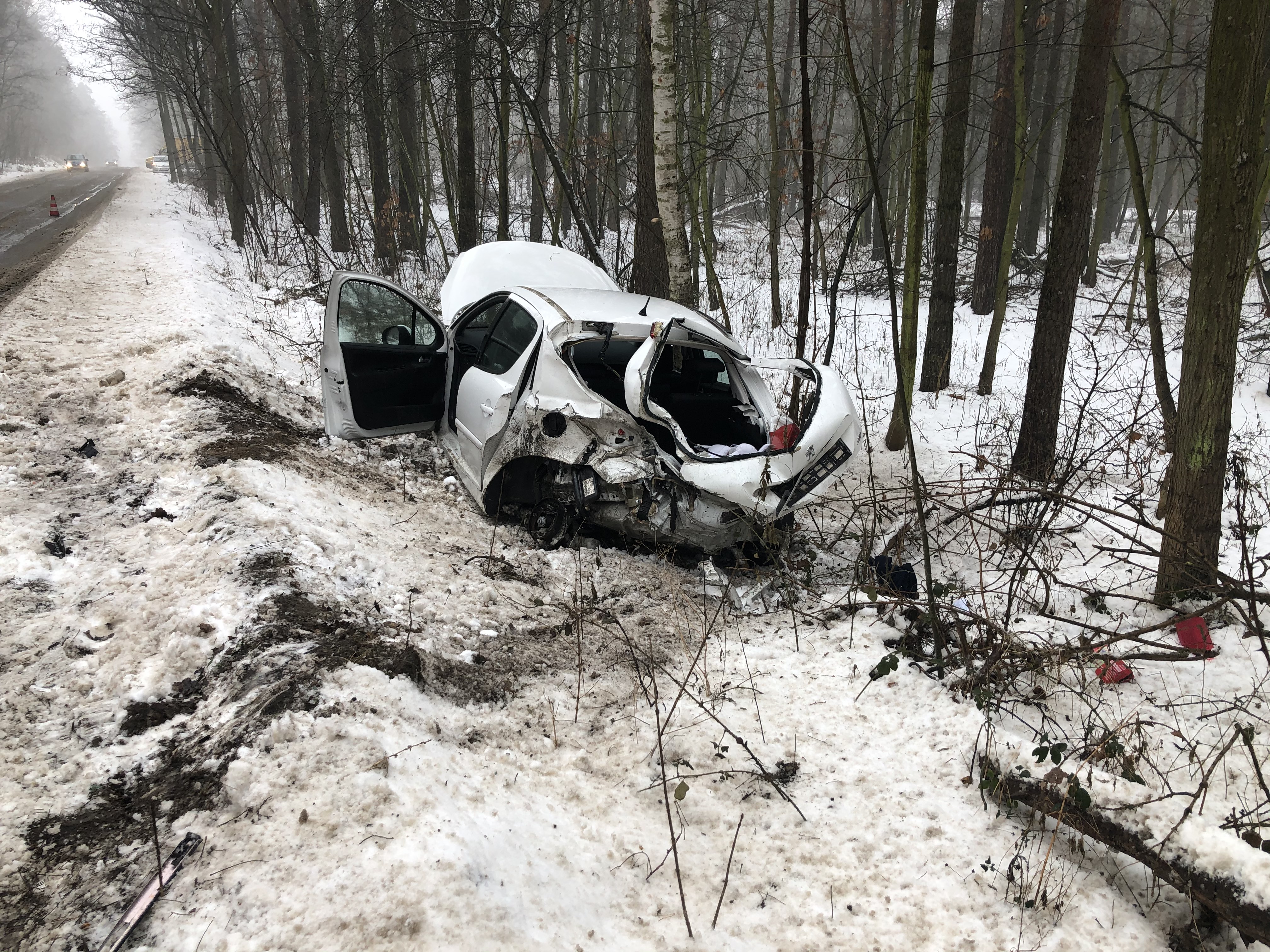Zgłoszenie o pierwszym wypadku wpłynęło do Stanowiska Kierowania Komendanta Miejskiego PSP w Koninie przed godz. 9.00. W miejscowości Lisiec Mały na ul. Konińskiej, gmina Stare Miasto kierująca samochodem osobowym z niewyjaśnionych dotąd przyczyn uderzyła w betonowe ogrodzenie przydrożnej kapliczki. Po przybyciu na miejsce zdarzenia zastano leżący na boku samochód osobowy marki Citroen. Wewnątrz pojazdu znajdowała się kobieta. Działania strażaków polegały na zabezpieczeniu miejsca zdarzenia, stabilizacji pojazdu oraz wykonaniu dostępu do poszkodowanej osoby poprzez wycięcie przedniej szyby. Ratownicy udzielili kierującej kwalifikowanej pierwszej pomocy, która następnie została przetransportowana przez Zespół Ratownictwa Medycznego do szpitala. W zdarzeniu brali udział strażacy z Jednostki Ratowniczo – Gaśniczej Nr 2 w Koninie oraz druhowie z OSP Lisiec Wielki.