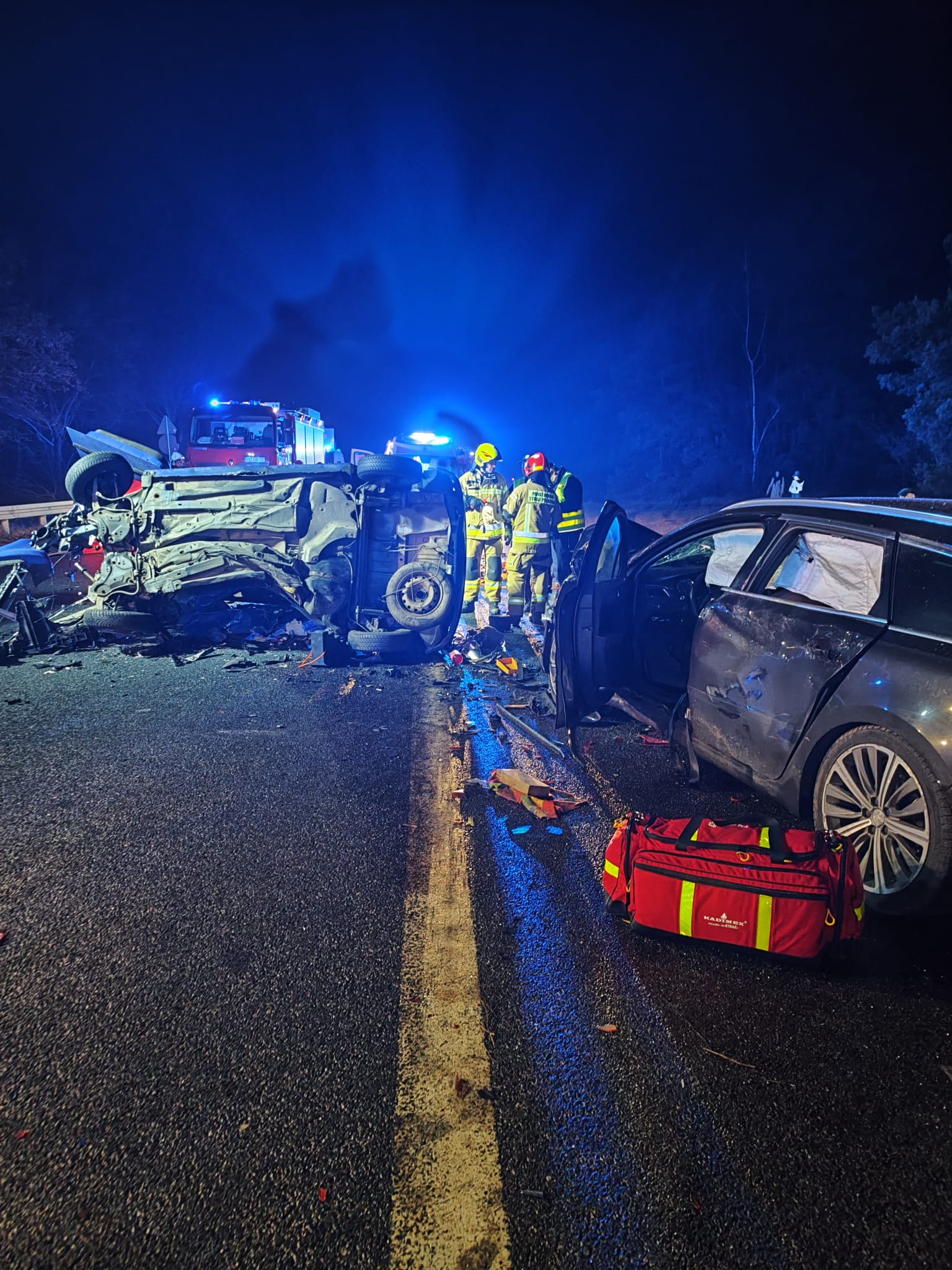 Działania strażaków polegały na wykonaniu dostępu do uwięzionego kierowcy przy pomocy urządzeń hydrauliczny, ewakuacji go z pojazdu oraz ze względu na brak funkcji życiowych przystąpieniu do resuscytacji krążeniowo – oddechowej. Niestety przybyły na miejsce zdarzenia lekarz stwierdził zgon mężczyzny, natomiast drugi poszkodowany uczestnik wypadku został przetransportowany do szpitala przez Zespół Ratownictwa Medycznego.