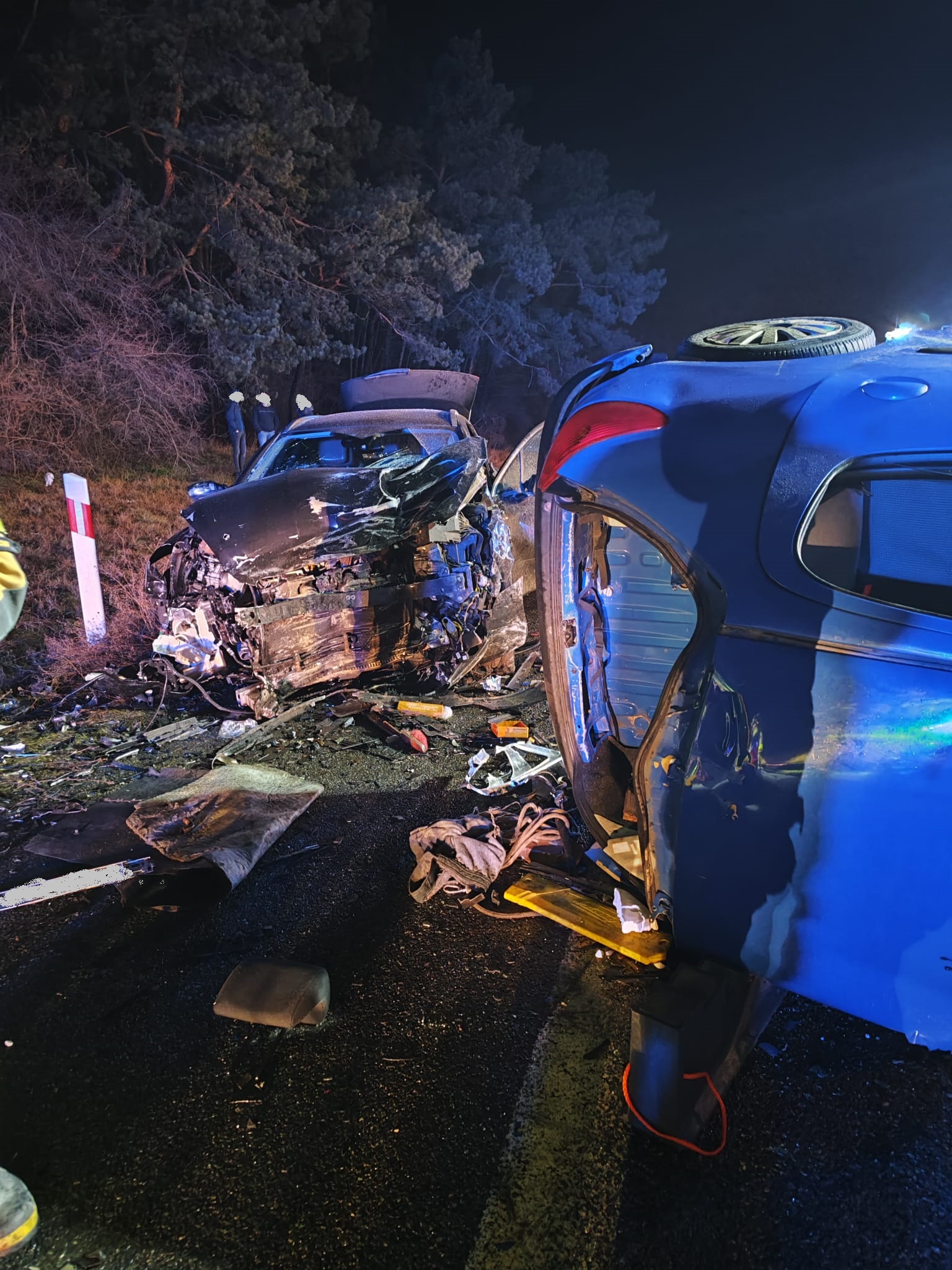 Po przybyciu na miejsce zdarzenia ustalono, że doszło do zderzenie dwóch samochodów osobowych. Pojazdy znajdowały się na jezdni, blokując całkowicie drogę krajową nr 92. Kierowca samochodu marki Peugeot 508 opuścił pojazd o własnych siłach, natomiast w drugim pojeździe marki Peugeot 206 znajdował się uwięziony i nieprzytomny kierowca.