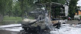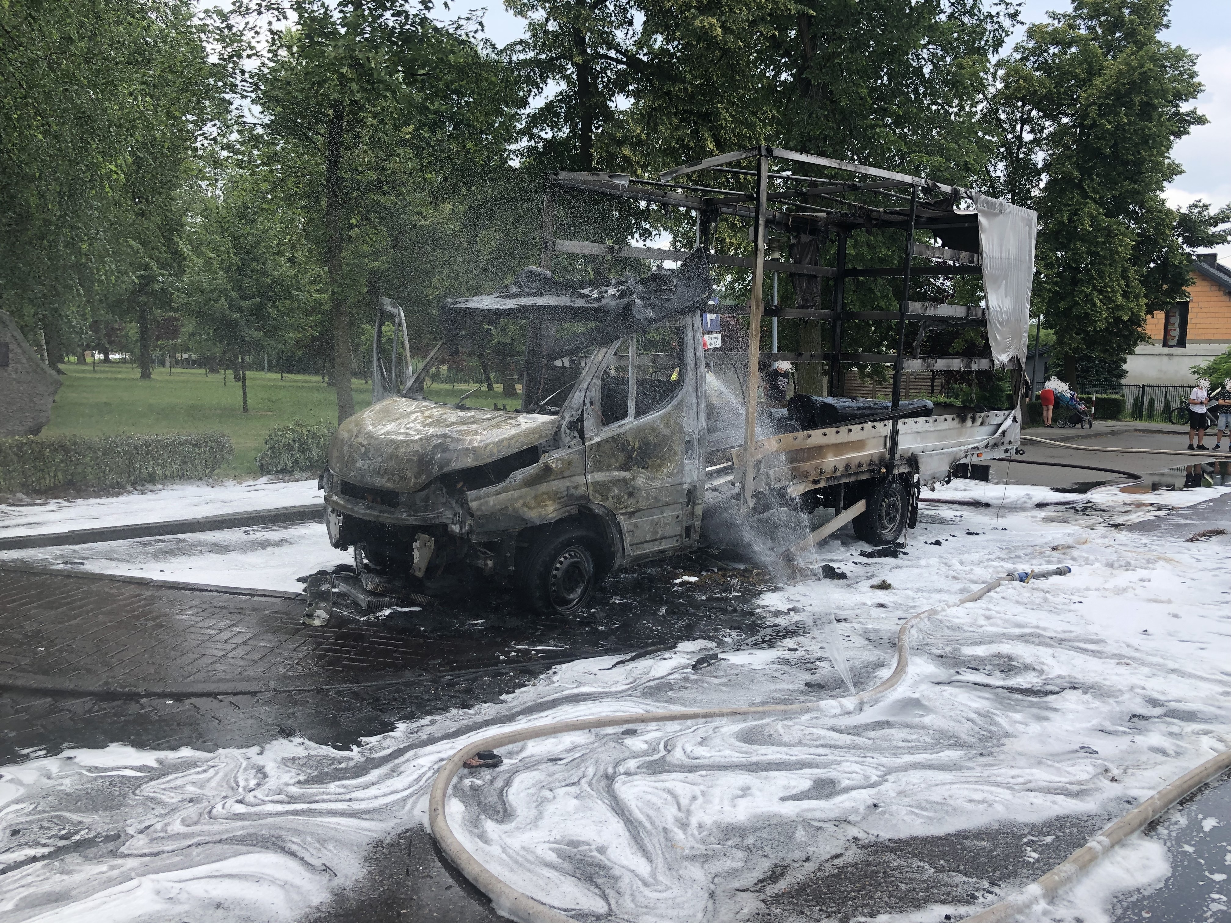 nr 443 zapalił się samochodu marki IVECO. Po przybyciu na miejsce zdarzenia zastano całkowicie objęty pożarem pojazd. Strażacy podali pianę gaśniczą na palący się samochód,