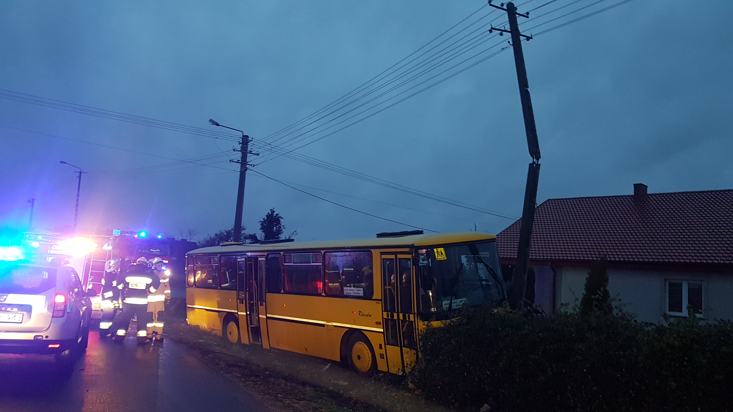 Po przybyciu na miejsce ustalono, że na skrzyżowaniu dróg gminnych doszło do zderzenia samochodu osobowego z autobusem. Samochodem osobowym podróżowała jedna osoba, natomiast autobusem pięć osób, w tym kierowca oraz opiekun i trójka dzieci. Wszyscy uczestnicy wypadku opuścili pojazdy o własnych siłach przed przybyciem strażaków. Dzieci zostały zabrane przez rodziców do domu. Autobus przodem uderzył w betonowy słup energetyczny, który uległ złamaniu, w związku z powyższym na miejsce wezwano Pogotowie Energetyczne.