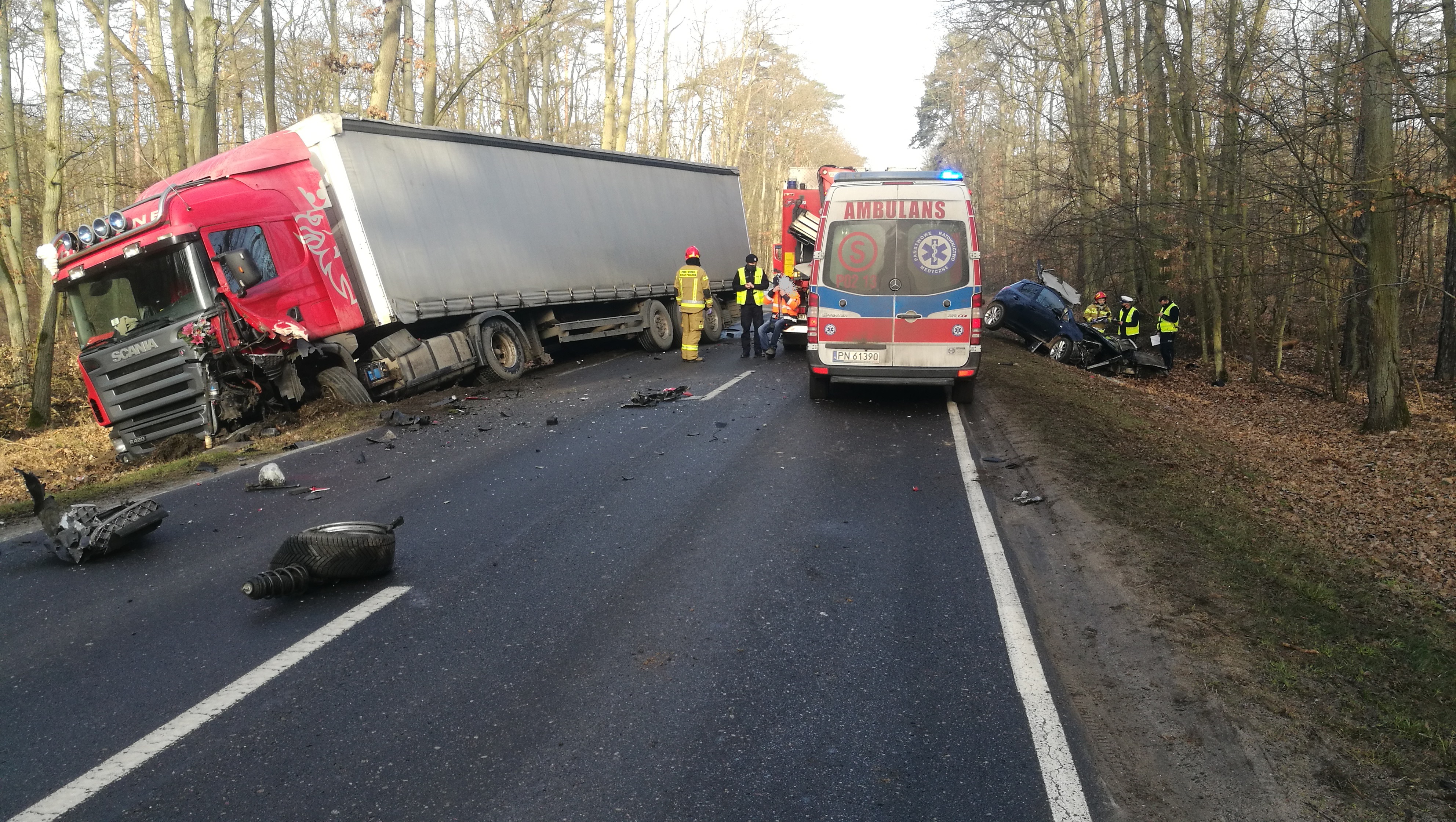 Po przybyciu na miejsce zdarzenia ustalono, że doszło do zderzenia samochodu osobowego z samochodem ciężarowym. Pojazd ciężarowy znajdował się częściowo w rowie, a kierowca nie wymagał udzielenia pomocy. W samochodzie osobowym, który po zderzeniu wpadł do przydrożnego rowu znajdowała się uwięziona kobieta. Droga wojewódzka została całkowicie zablokowana.