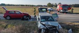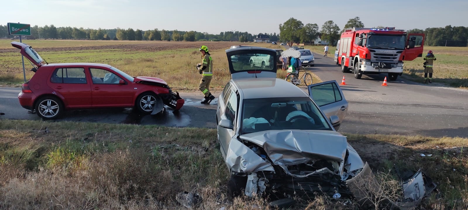 Po przybyciu na miejsce zdarzenia stwierdzono, że na drodze powiatowej doszło do zderzenia dwóch samochodów osobowych, w tym VW którym podróżował wyłącznie kierowca oraz Skoda, którą podróżowała matka z dwójką dzieci. Wszyscy uczestniczy wypadku opuścili pojazdy o własnych siłach przed przybyciem strażaków.