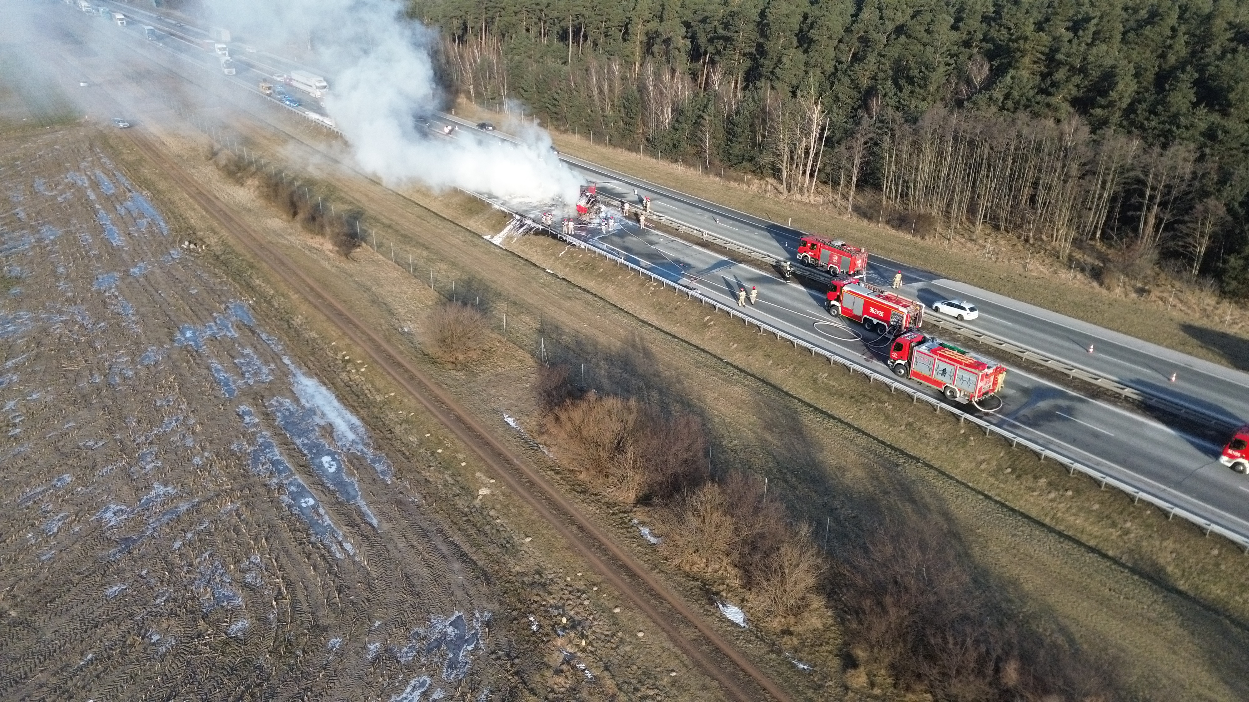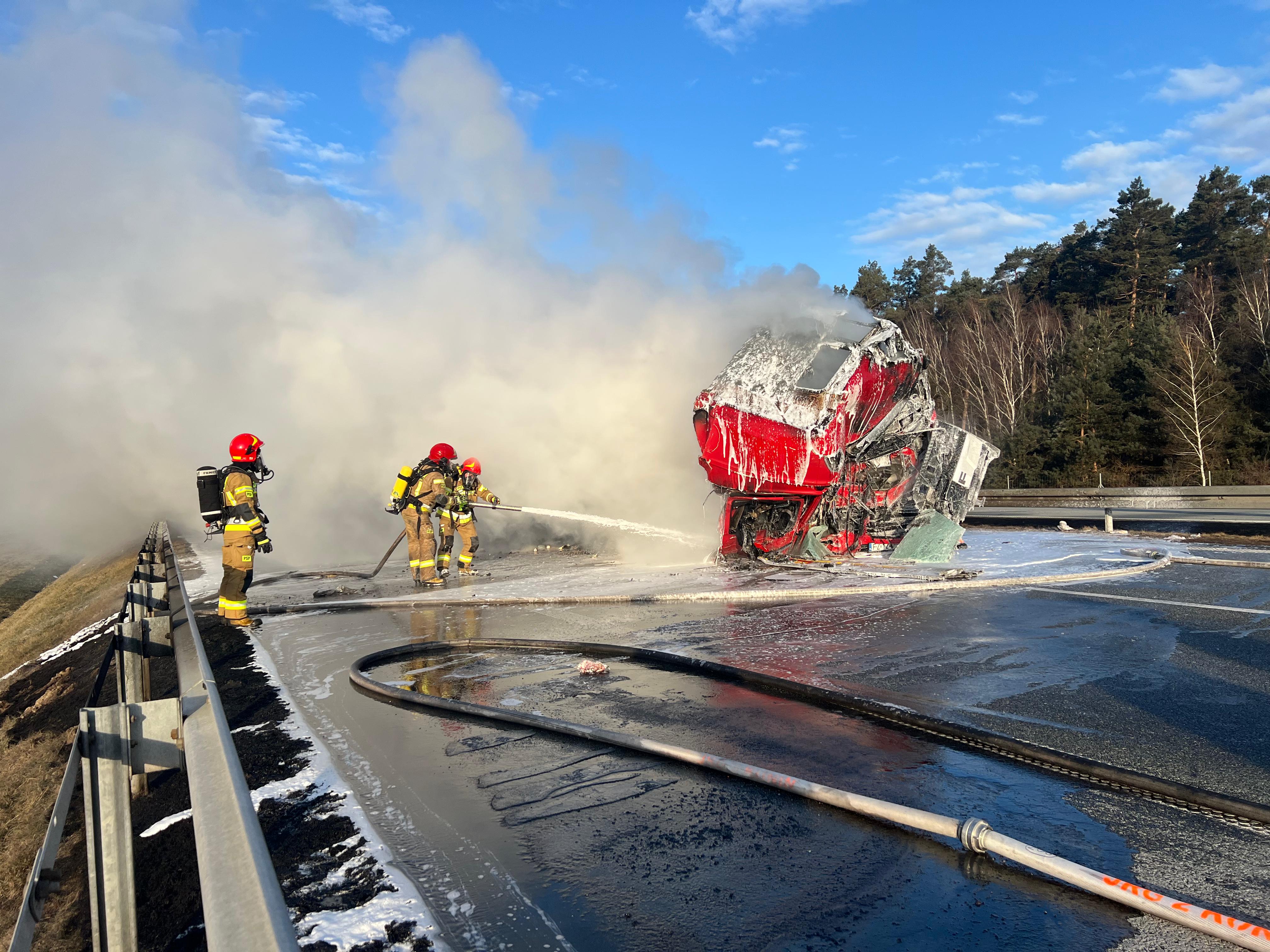 w natarciu na palący się pojazd. W momencie gaszenia pożaru Autostrada A2 została całkowicie zablokowana w obu kierunkach.