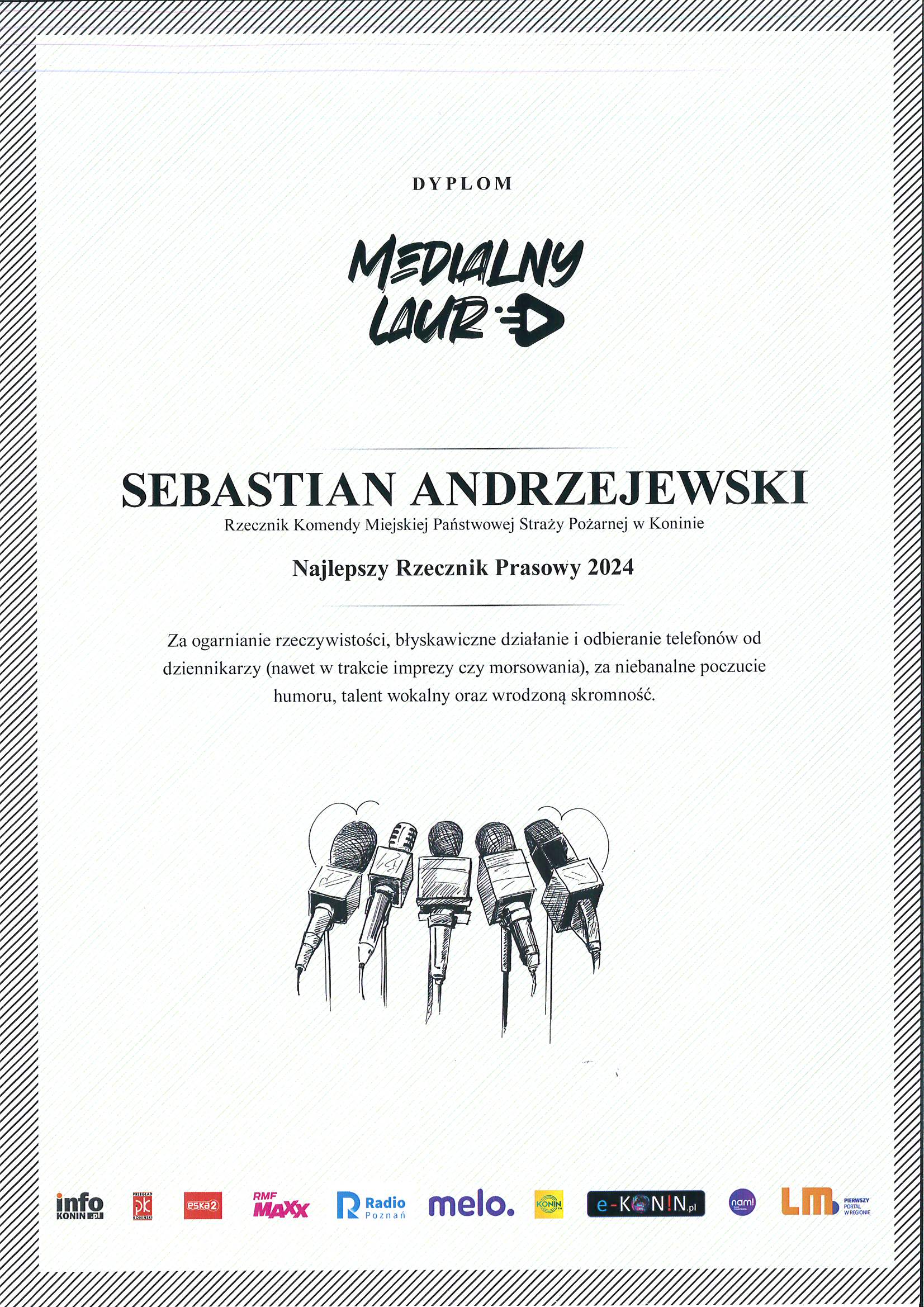 13 lutego 2025 r. podczas odprawy służbowej w siedzibie Komendy Miejskiej Państwowej Straży Pożarnej w Koninie, dziennikarze z terenu powiatu konińskiego wręczyli st. kpt. Sebastianowi Andrzejewskiemu, Oficerowi Prasowemu Komendanta Miejskiego PSP w Koninie Złoty Laur w kategorii NAJLEPSZY RZECZNIK PRASOWY 2024.