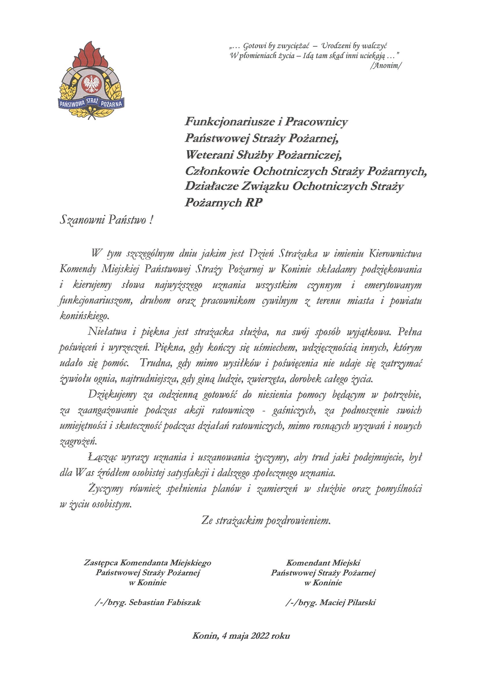 ŻYCZENIA KOMENDANTA MIEJSKIEGO PSP W KONINIE Z OKAZJI DNIA STRAŻAKA 04.05.2022 Zdjęcia (1) Pokaż zdjęcie 1 z galerii.