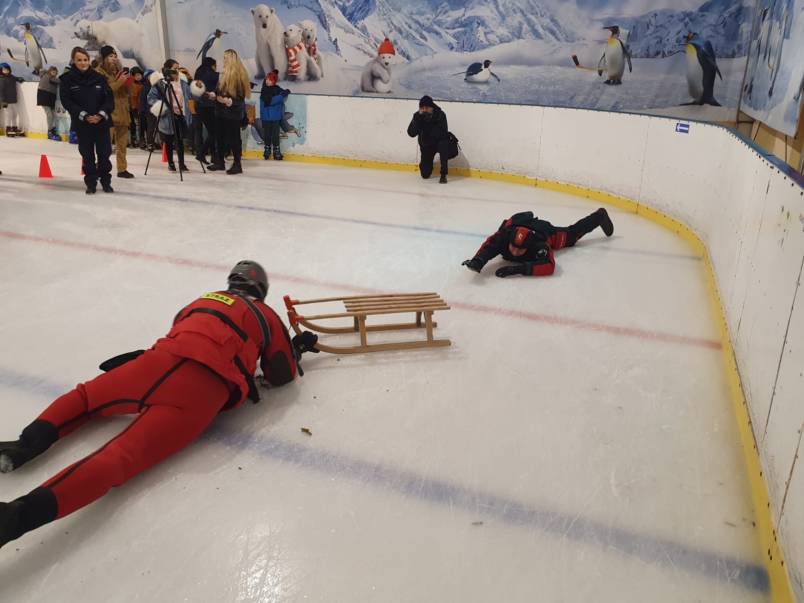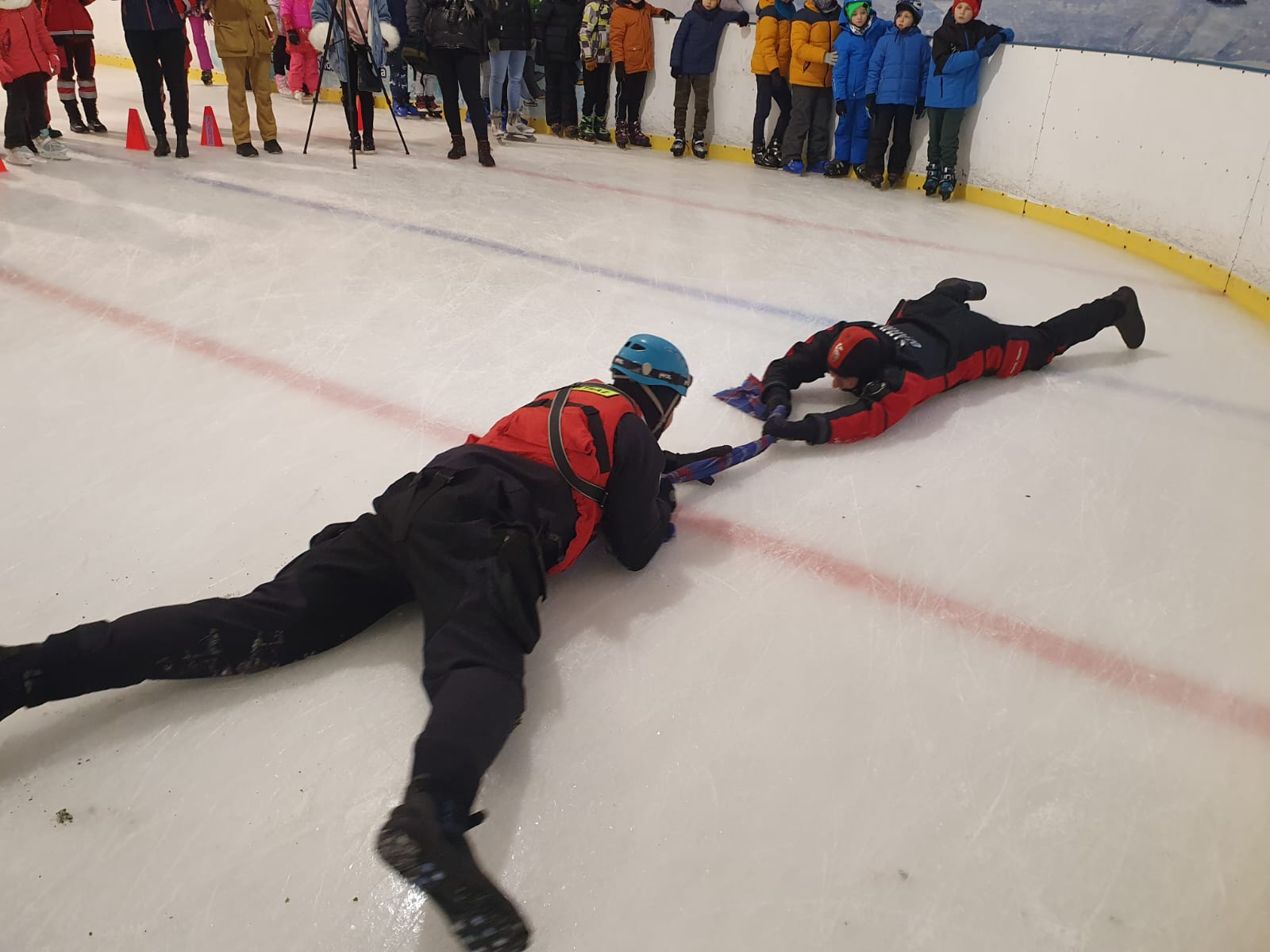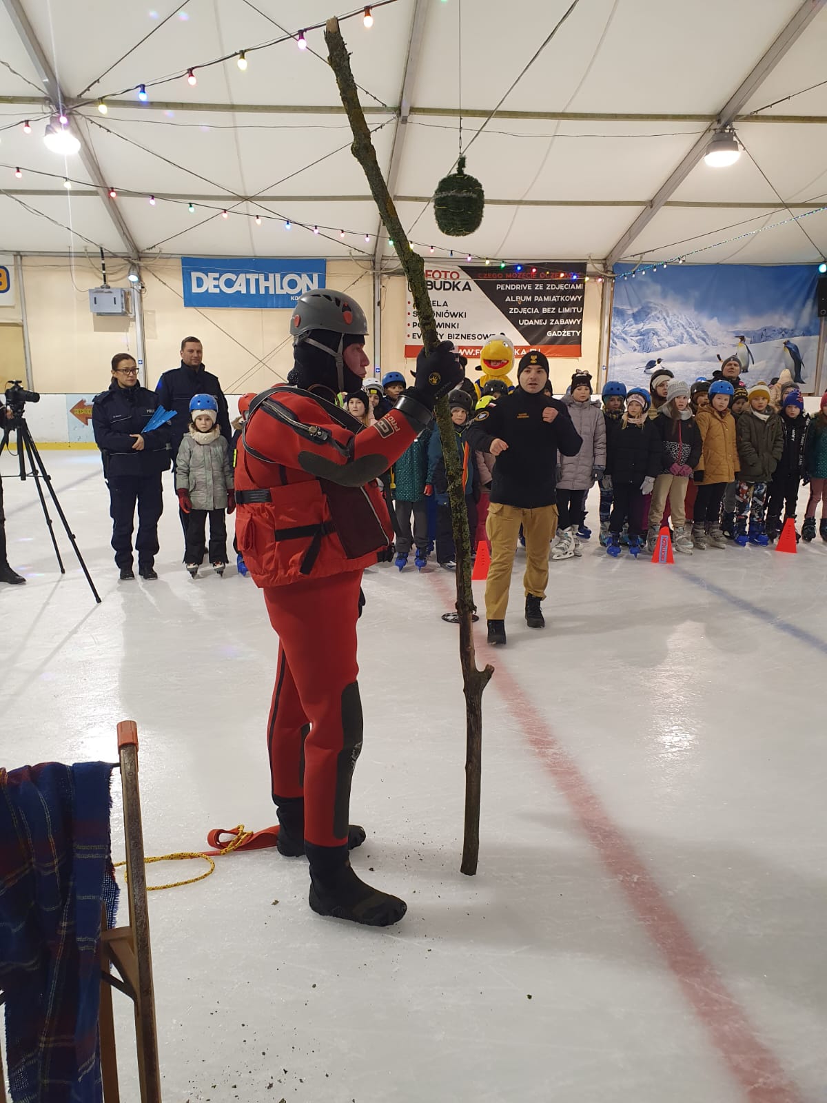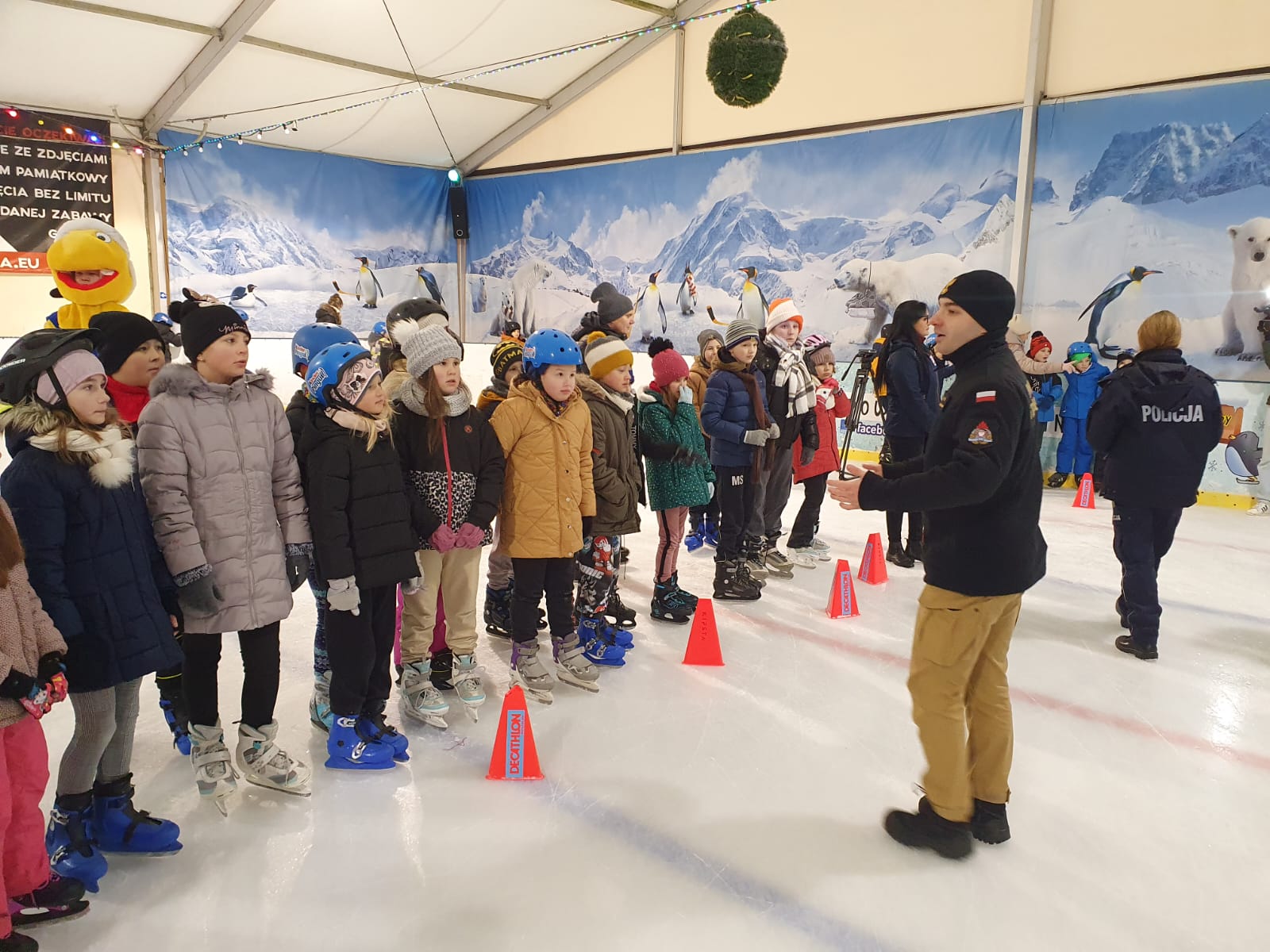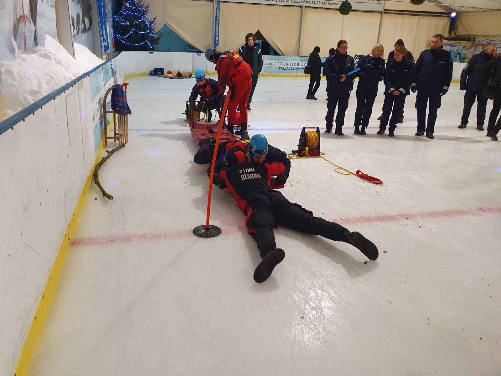 W dniu 10.01.2024 r., na tafli koszalińskiego lodowiska Alaska, odbyło się spotkanie służb z dziećmi. Podczas wydarzenia Komenda Miejska Państwowej Straży Pożarnej w Koszalinie, Komenda Miejska Policji w Koszalinie, Straż Miejska w Koszalinie oraz Grupa Ratownictwa PCK Koszalin przeprowadzili zajęcia edukacyjne na temat bezpiecznych ferii zimowych. Dzieci przez zabawę poznały numer alarmowy, przeprowadziły resuscytację na fantomie. Grupa nurkowa z JRG 1 przeprowadziła pokaz technik ratownictwa lodowego, które stosuje się, gdy ktoś będzie w niebezpieczeństwie, na zamarzniętym akwenie